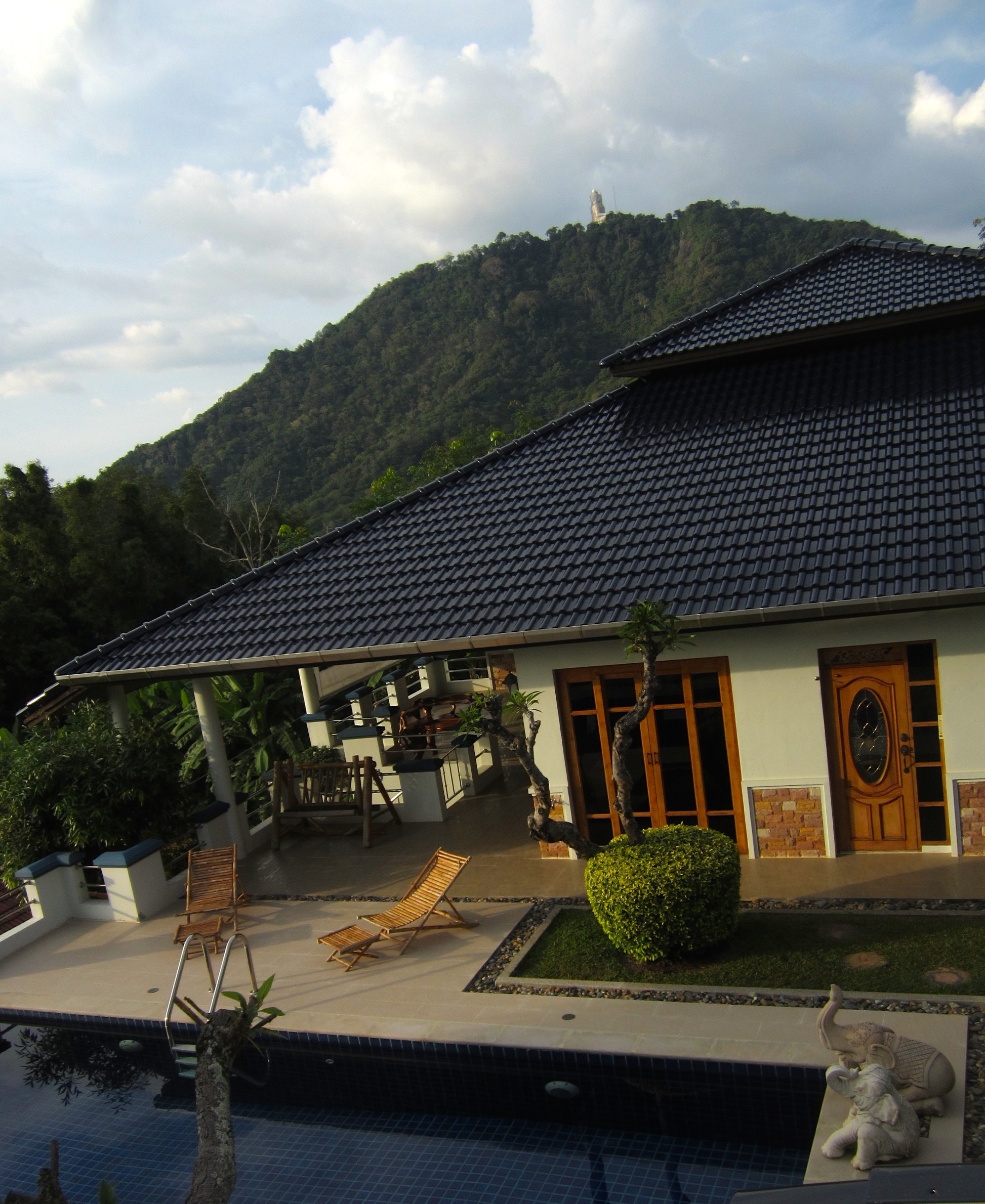 sunset fall behind the 45m high Big Buddha from the 40sqm swimming pool. A