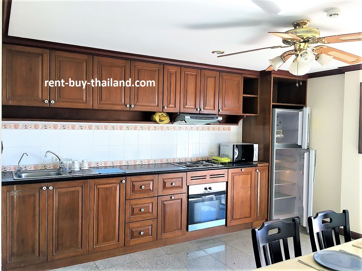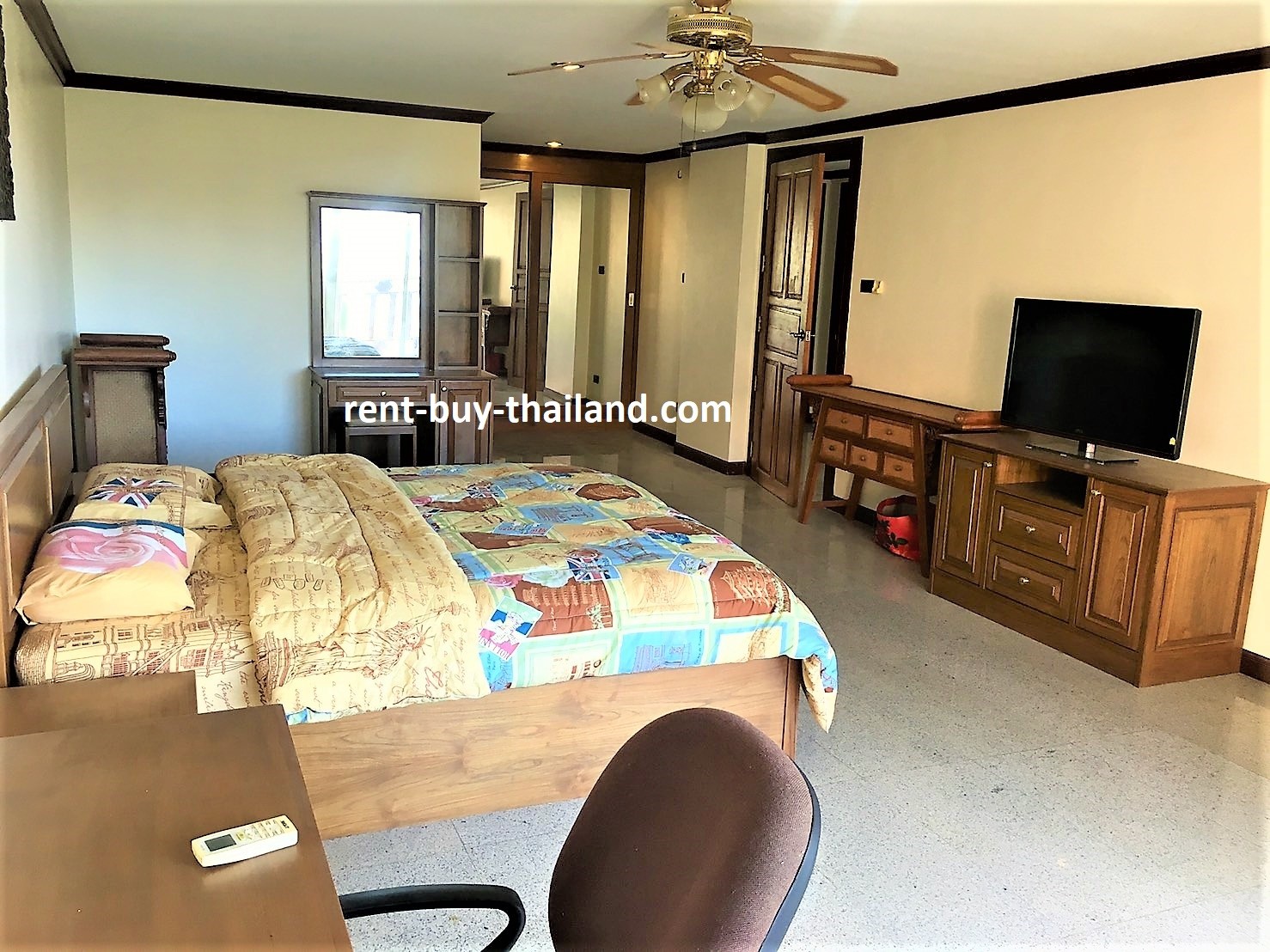 The apartment also benefits from tiled flooring, curtains, air conditioning and ceiling fans