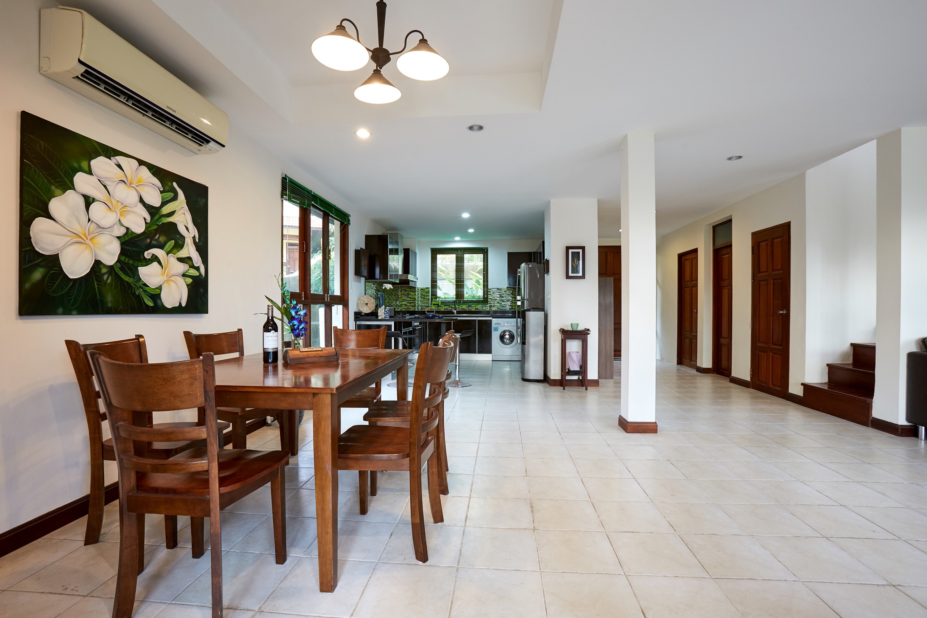 This Beautiful 4 bedroom pool villa with beach access has an open-plan living and dining area with a