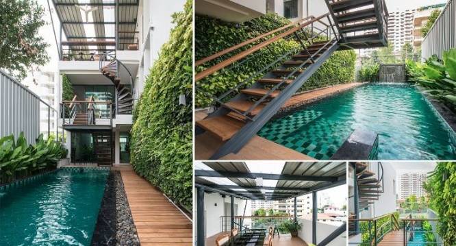 Swim pool and patio with waterfall and living green wall