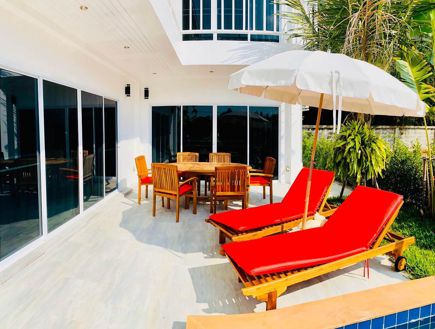 House for sale in Thailand, Rayong, close to beach (Mae Rumphueng Beach) 3 Bedrooms 3 Bathrooms with pool usable area 140 sqm, pool size 4 x 8 m. Terrace and garden 3 balconies fully furnished.