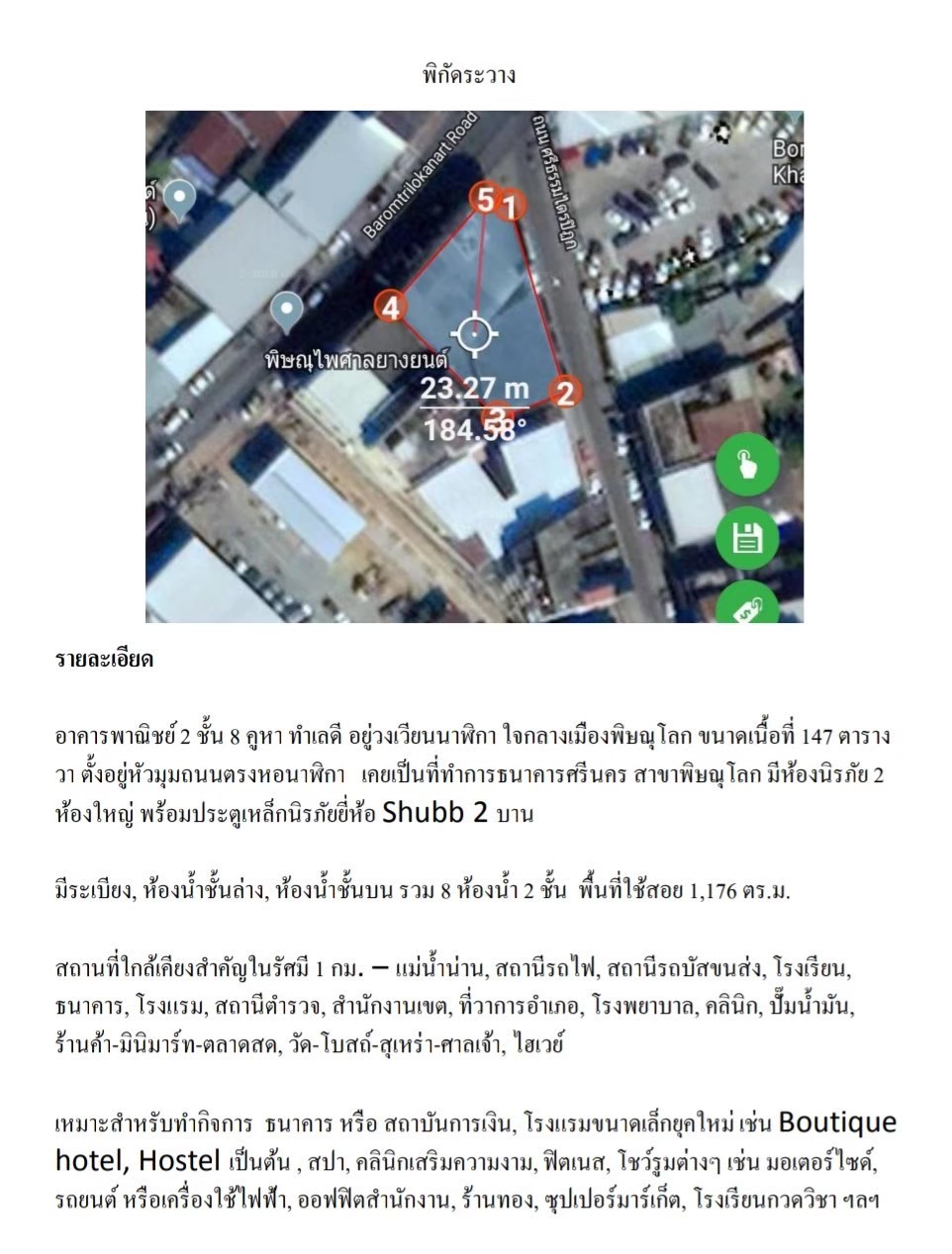 location for all business such as Fitness, Boutique hotel, Hostel, Coffee place, hang out place, restaurant, Pub&restautant etc. It was rent by the Bank years ago. So there is a vault which will go with the building, once you buy it. Nowaday it`s known as a landmark of Phisanulok. There are Banks around the area and not far from the river. Opposite the building is an empty land which can rent to be a carpark.