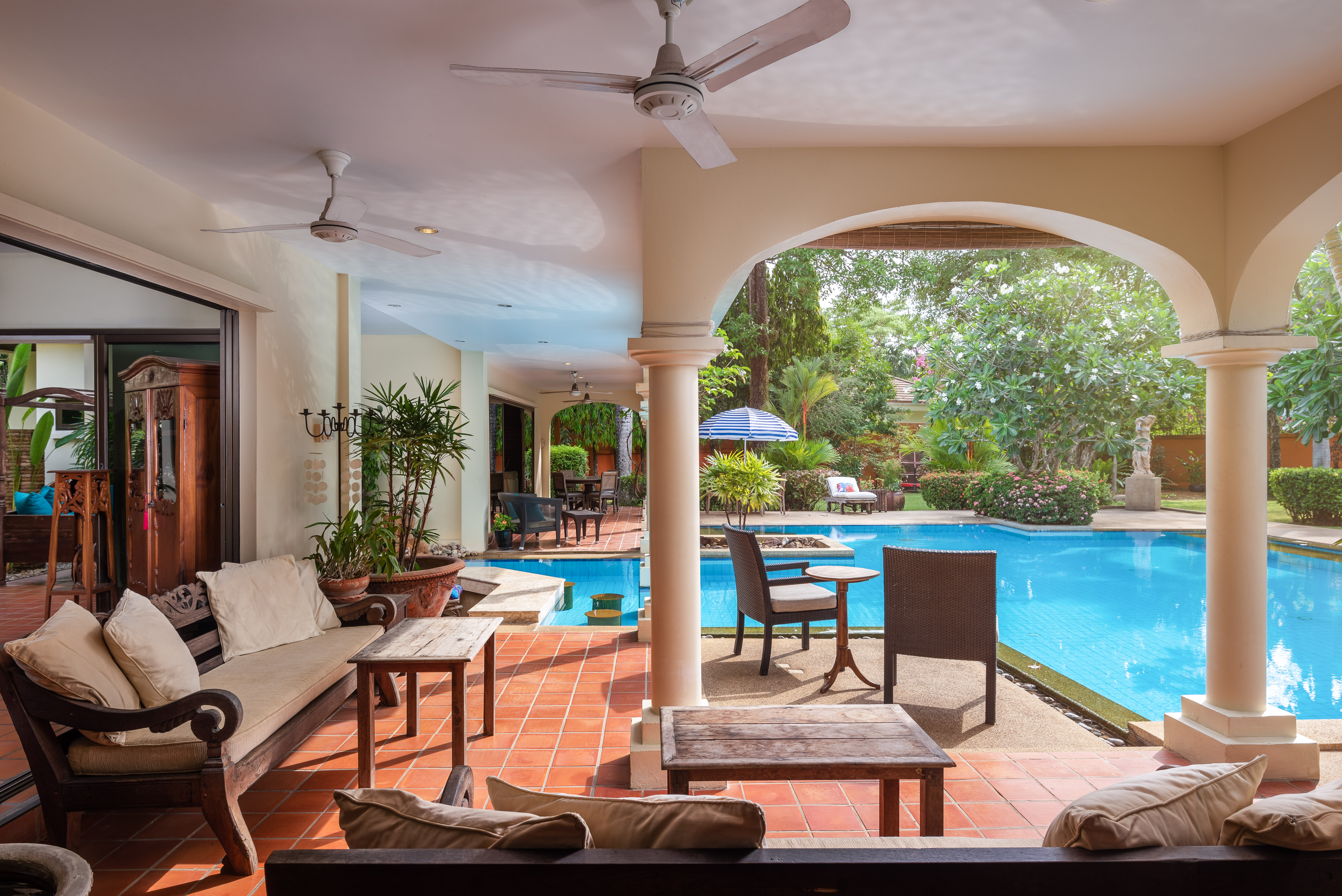 terrace undercover with ceiling fans overlooking the pool.