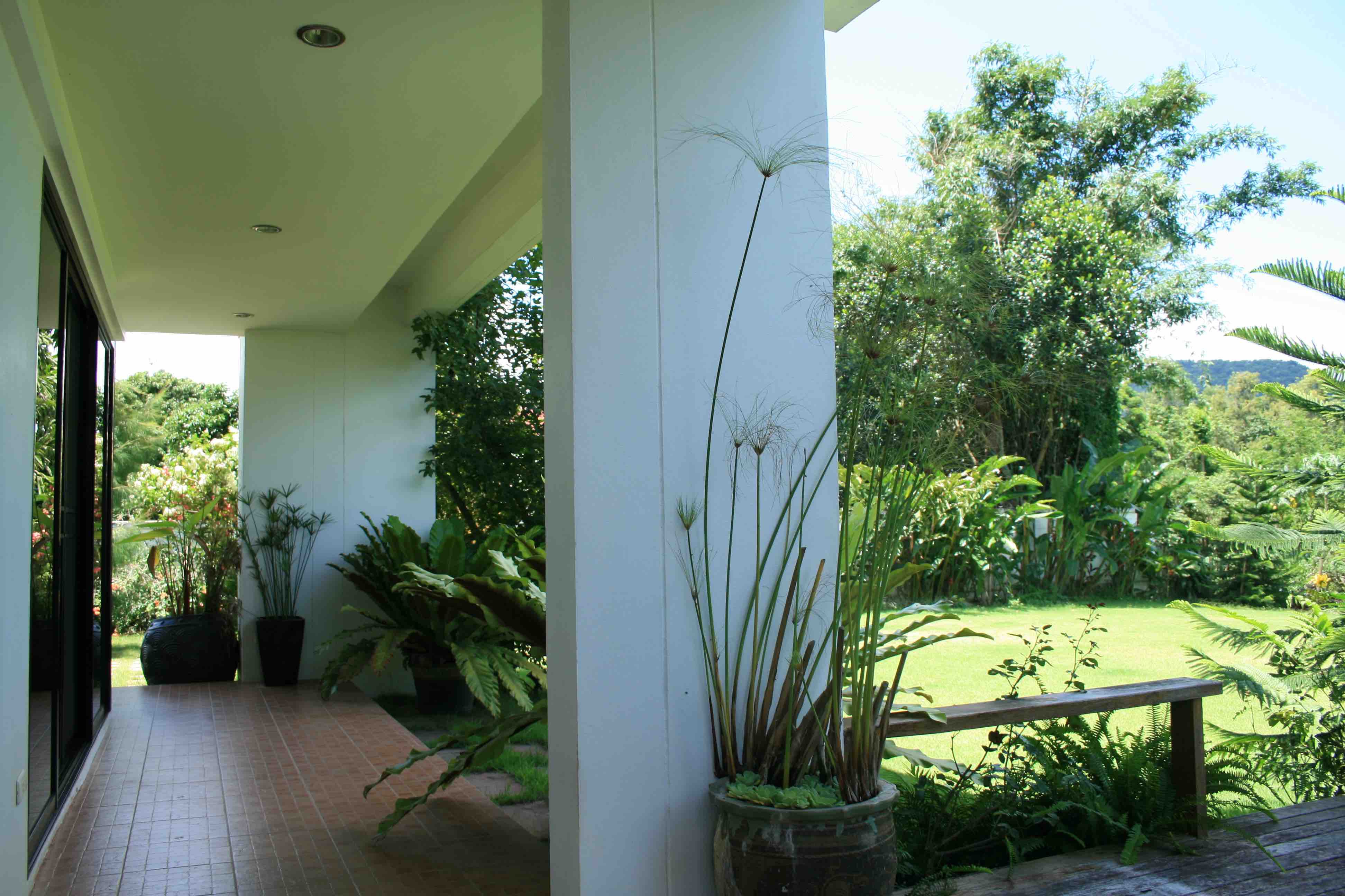 as an open air teakwood terrace on the ground floor front yard surrounded by bamboo, frangipani, pine