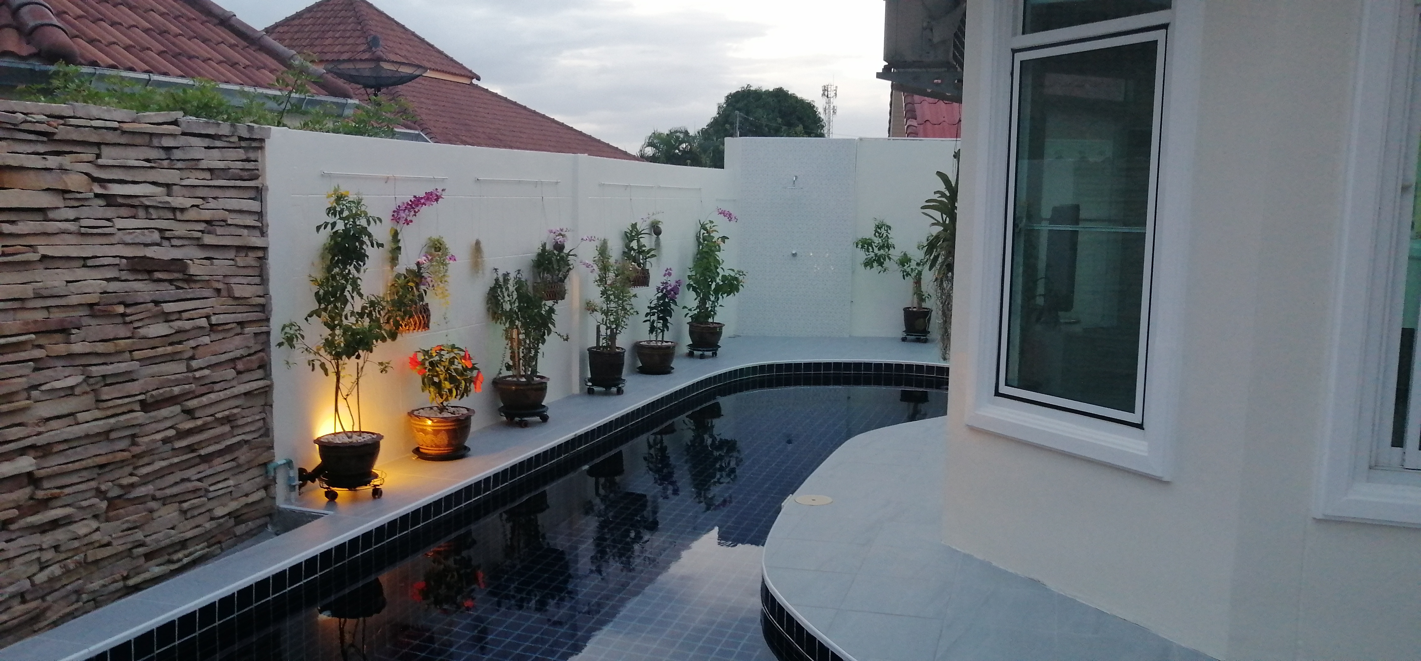 The pool area is completely tiled with granite stone tiles, has an outside