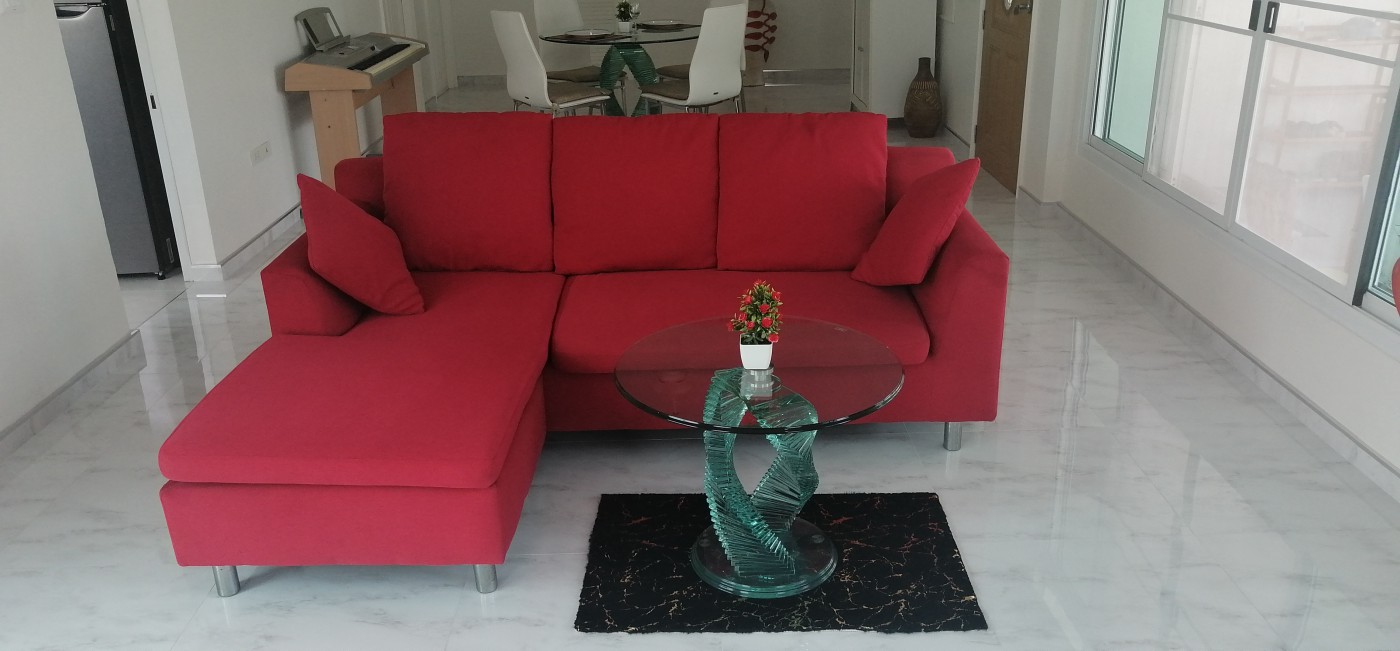 face the pool. The couch set is modern and has a turned glass table. The