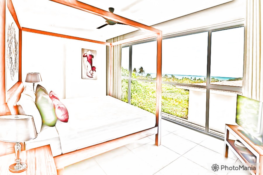 Large bedroom offering panoramic hillside and ocean views. Super king-size bed (180cm x 200cm) linked