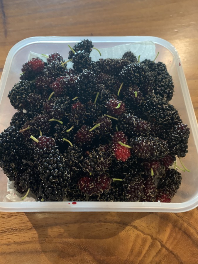 trees, blackberry , mulberry, many vegetables and much more. Also guest