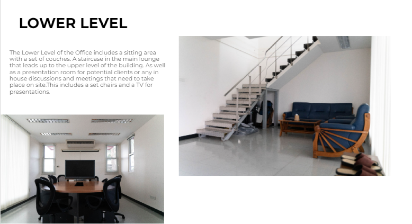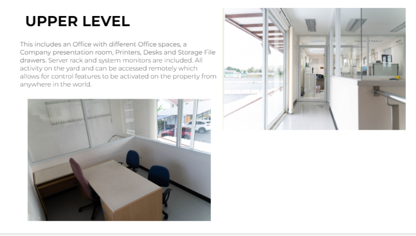 Upper Level: Includes Office with different Office spaces, a Company presentation room, Printers,