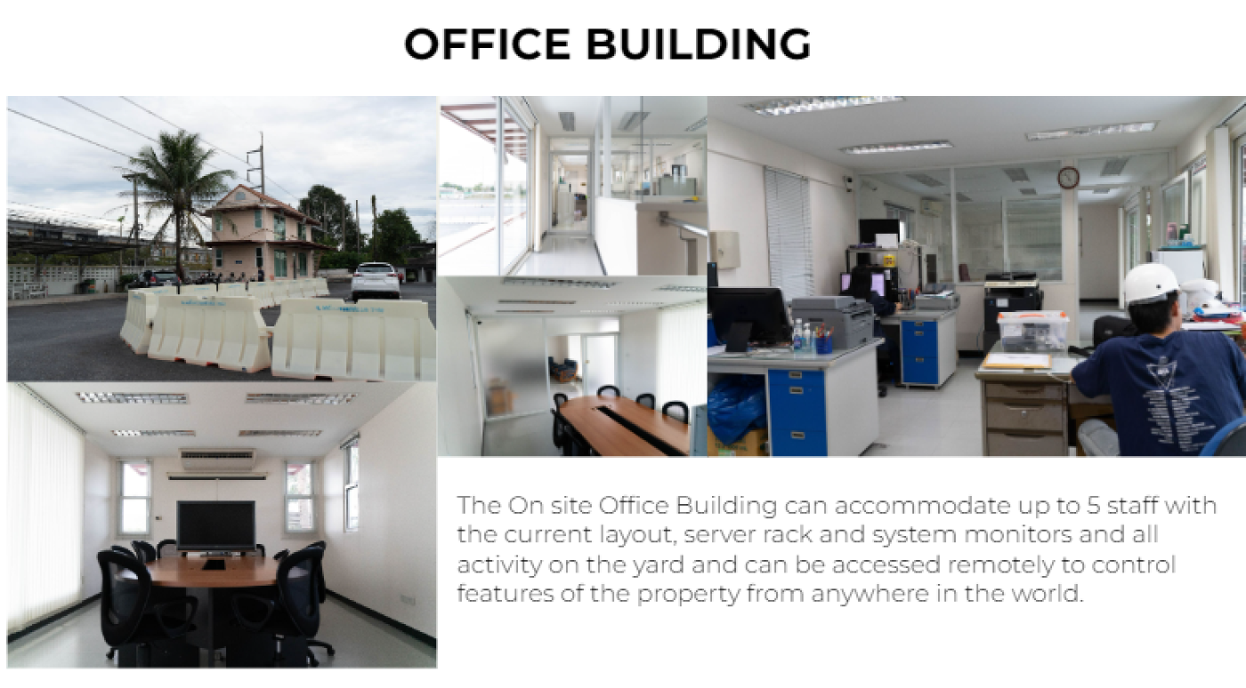 Desks, and Storage File drawers. Server rack and system monitors. All activity in the yard can be