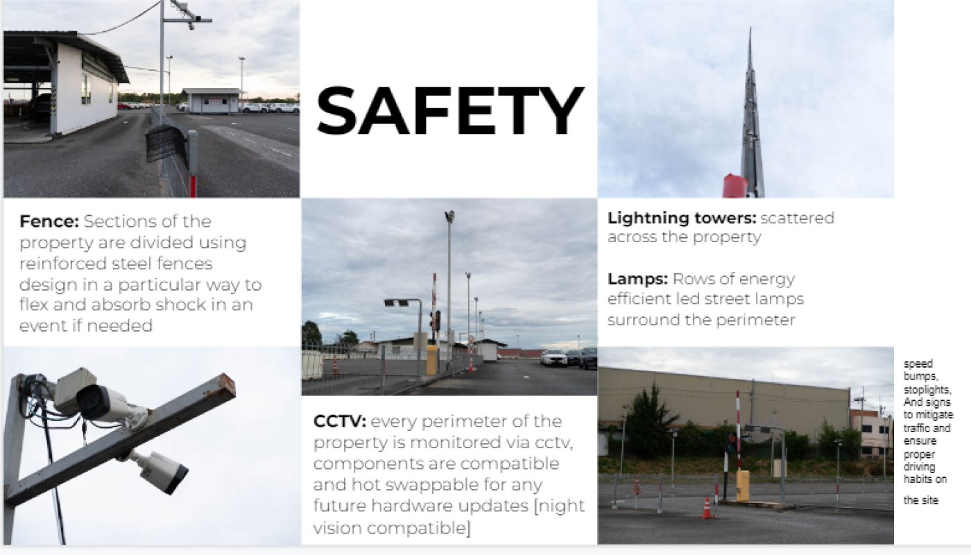 Checkpoint area: Entrance checkpoint, Gated Perimeters, Rolling car stopper, CCTV, LED Lamp