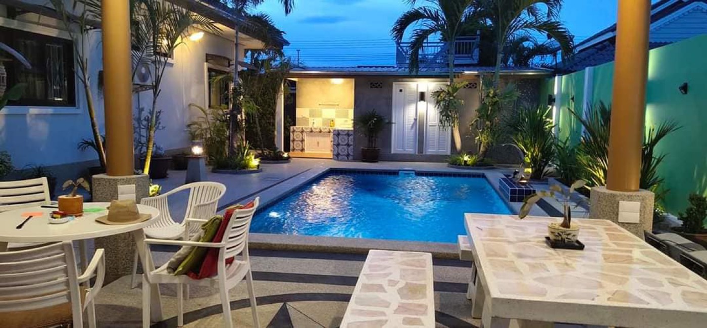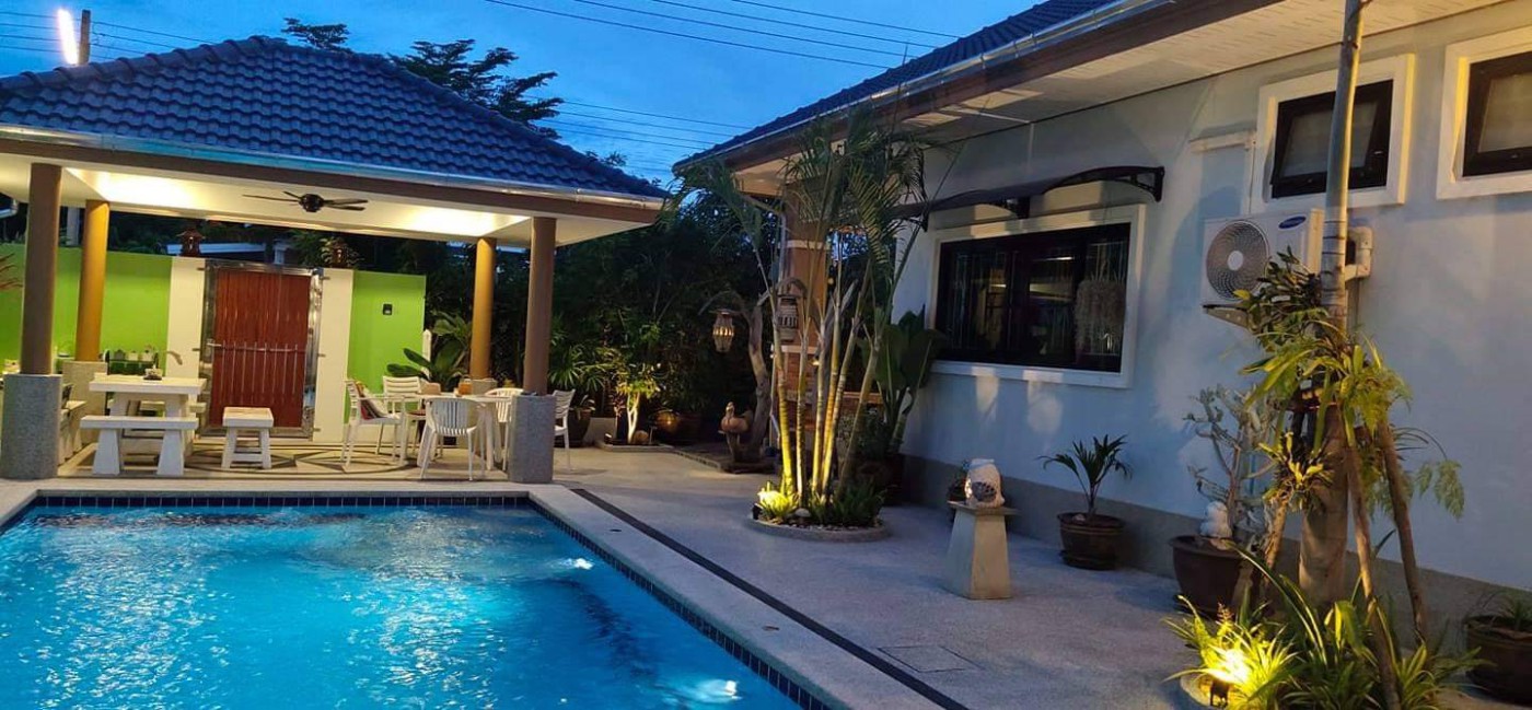 Selling a house in Cha-am District, Phetchaburi Province 432 sq m. 3 bedrooms, 3 bathrooms, 2 kitchens, has a pool, the floor around the pool is washed sand. There is space for party. Baan Plu Villa has furniture with air conditioner in every room in the house. Parking for 1 car. Can park in front of the road The road is wide, private, important, good weather, near the sea from the accommodation to the sea 7 kilometers 😊�`� near Cha-am city, fresh market of the sea . If Interested Please contact