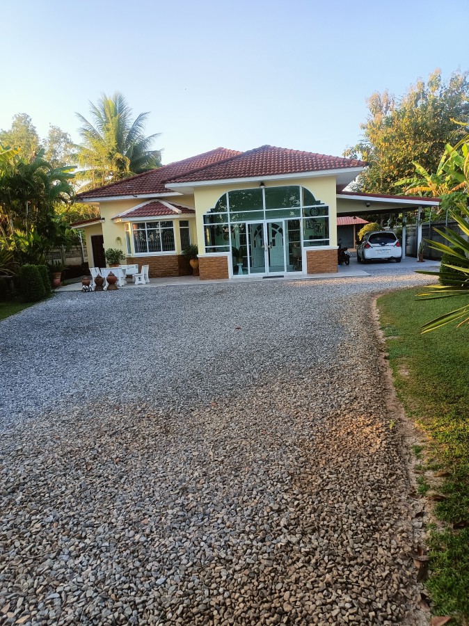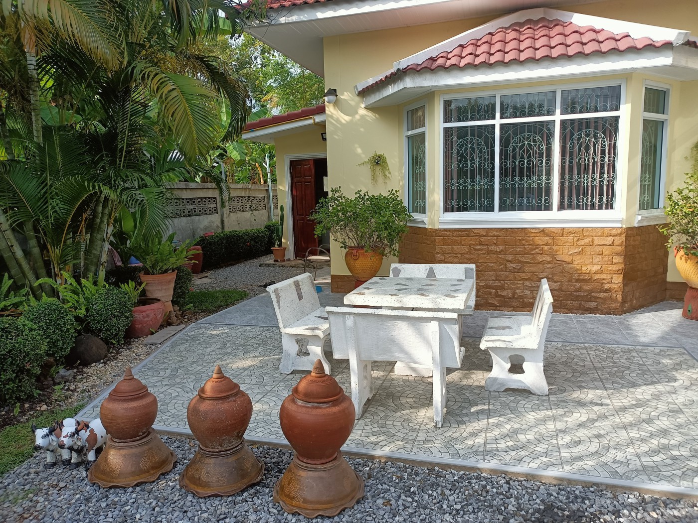 Architect Designed Individual Villa Consisting of 3 Bedrooms, 3 Bathrooms, 2 ensuite with aircon and ceiling fans , fully glazed and enclosed entrance porch, leading to a large lounge, through to a large dinning room, fully fitted European Style Kitchen, Utility / Laundry. Set in large mature well stocked gardens, that include detached garage with storeroom attached. Secure Parking for several cars, and outdoor seating area. Fully walled and Gated. Covered Car Port
