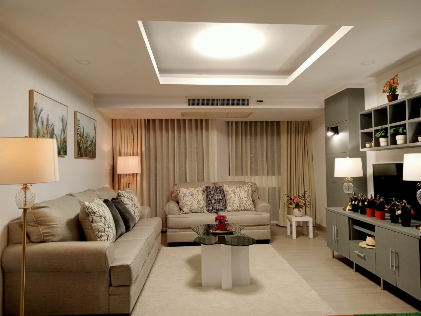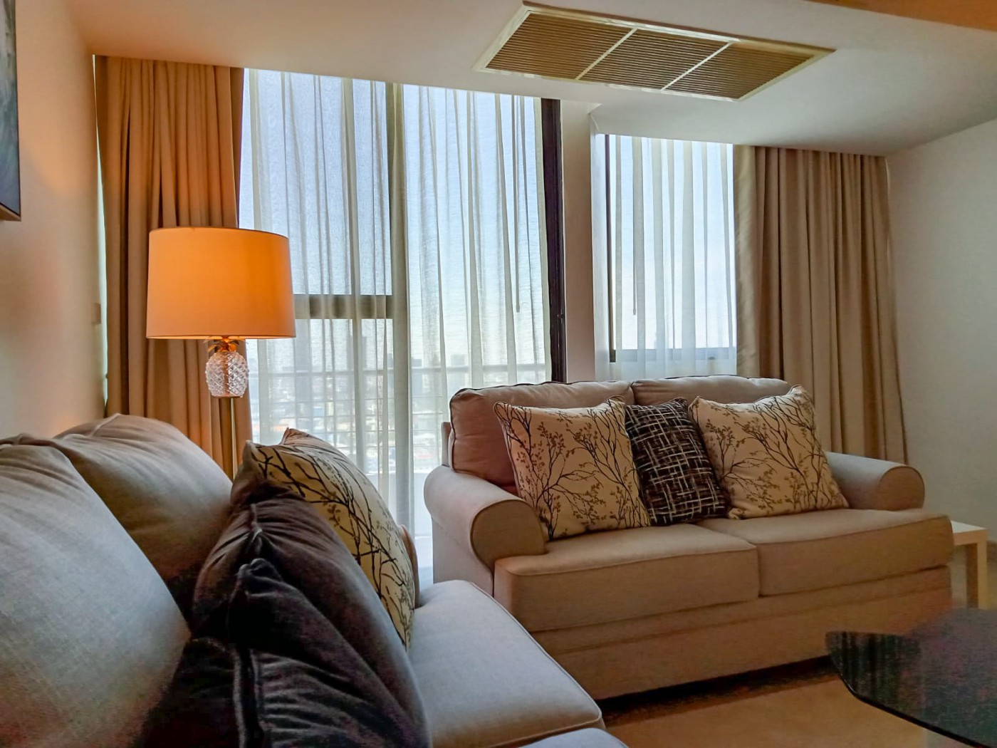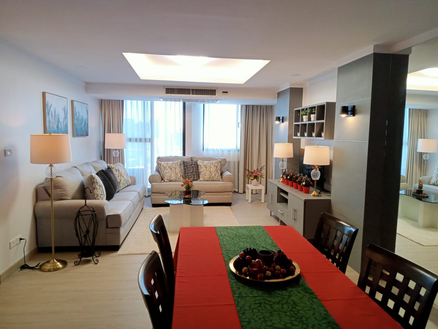 This 98m2 condo features two bedrooms, two bathrooms, a living, dining and kitchen area as well as a