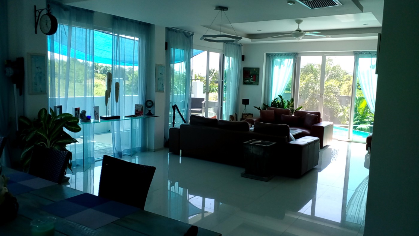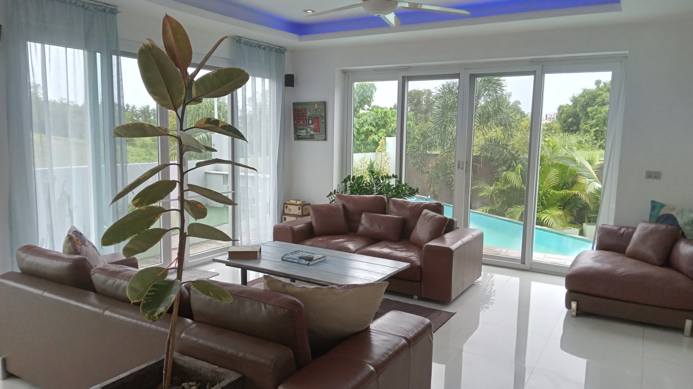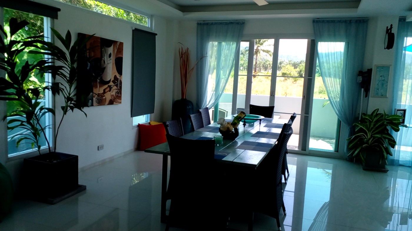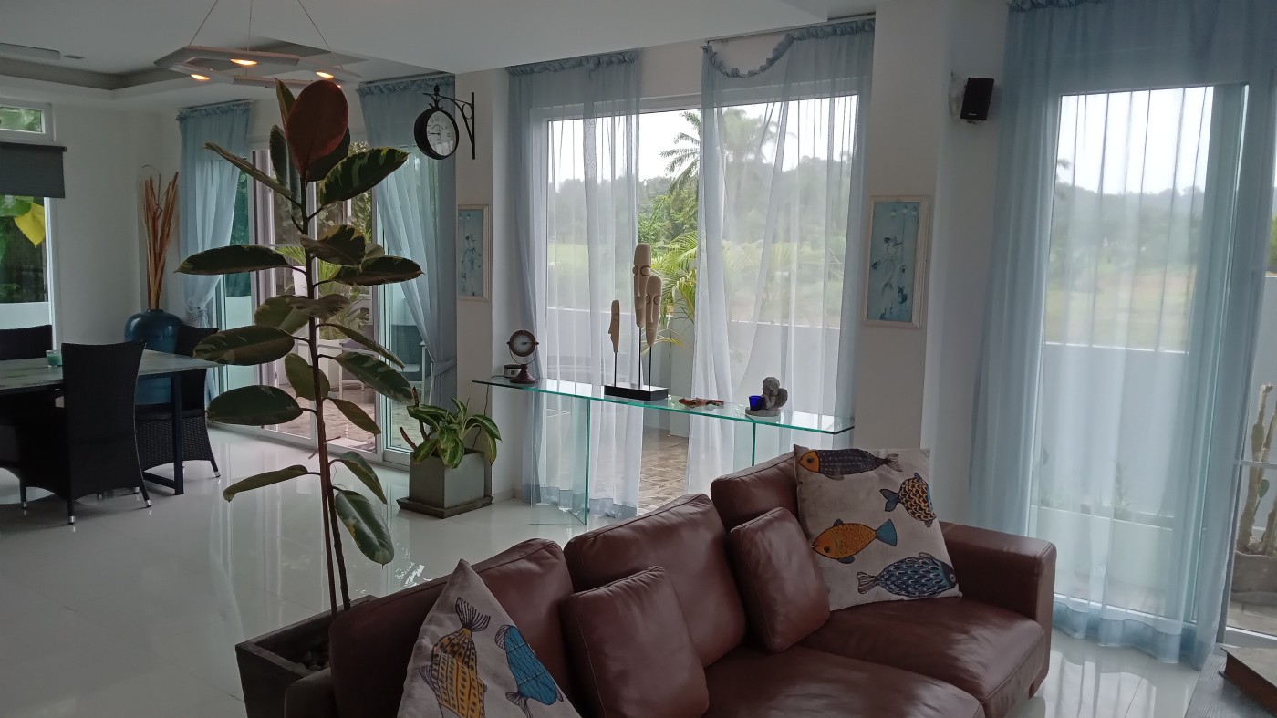 Golf and mountain views..Private Salt water Pool Villa with jacuzzi in pool,large pool deck, Garden,Electric Entrance Gate.3 Master en-suite bedrooms.1 guest bathroom. Huge Kitchen. Dining seats 8/10. 2 outdoor showers. Covered parking. Security Cams. Large flat roof Easy transfer Thai Company.