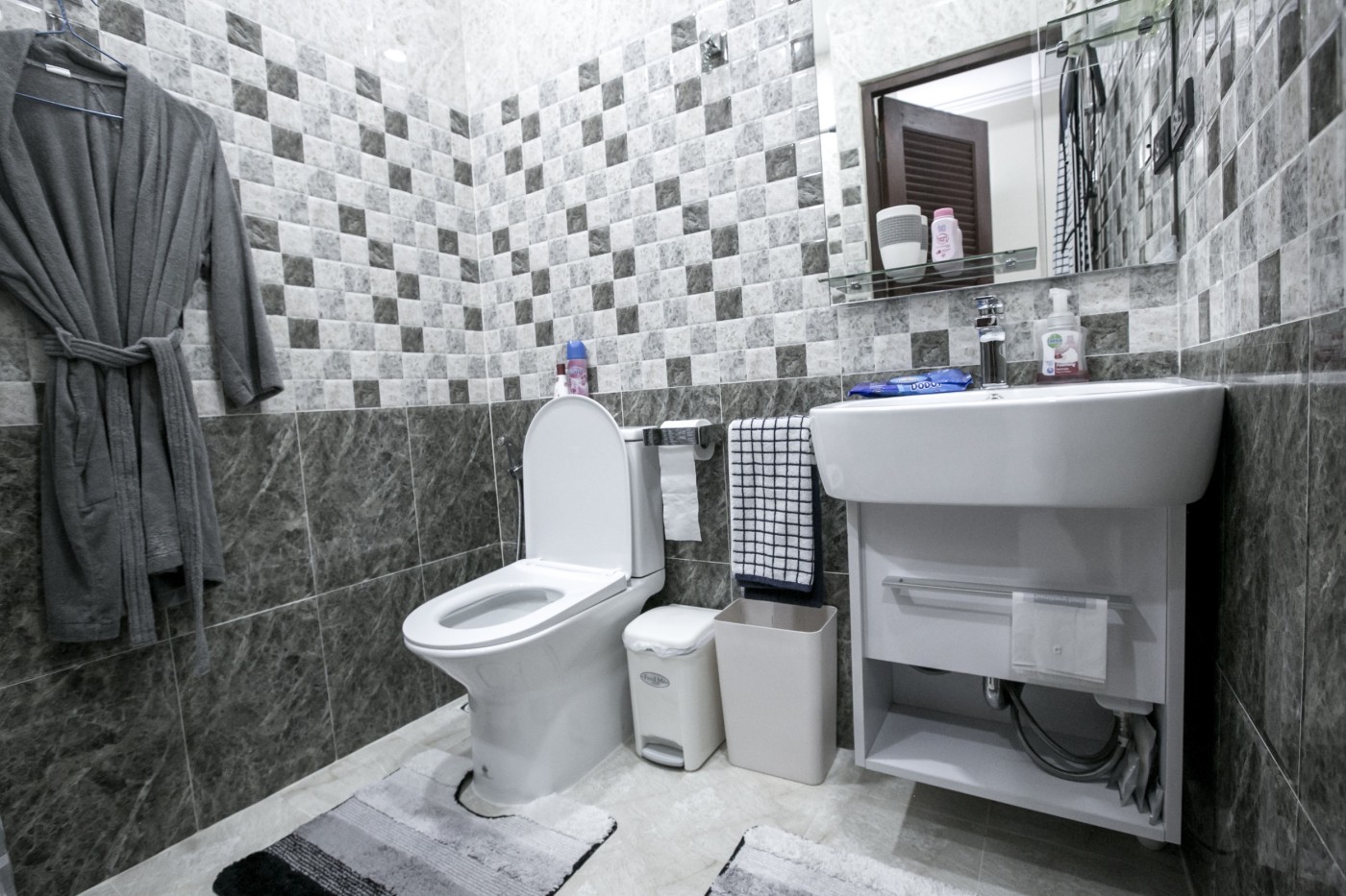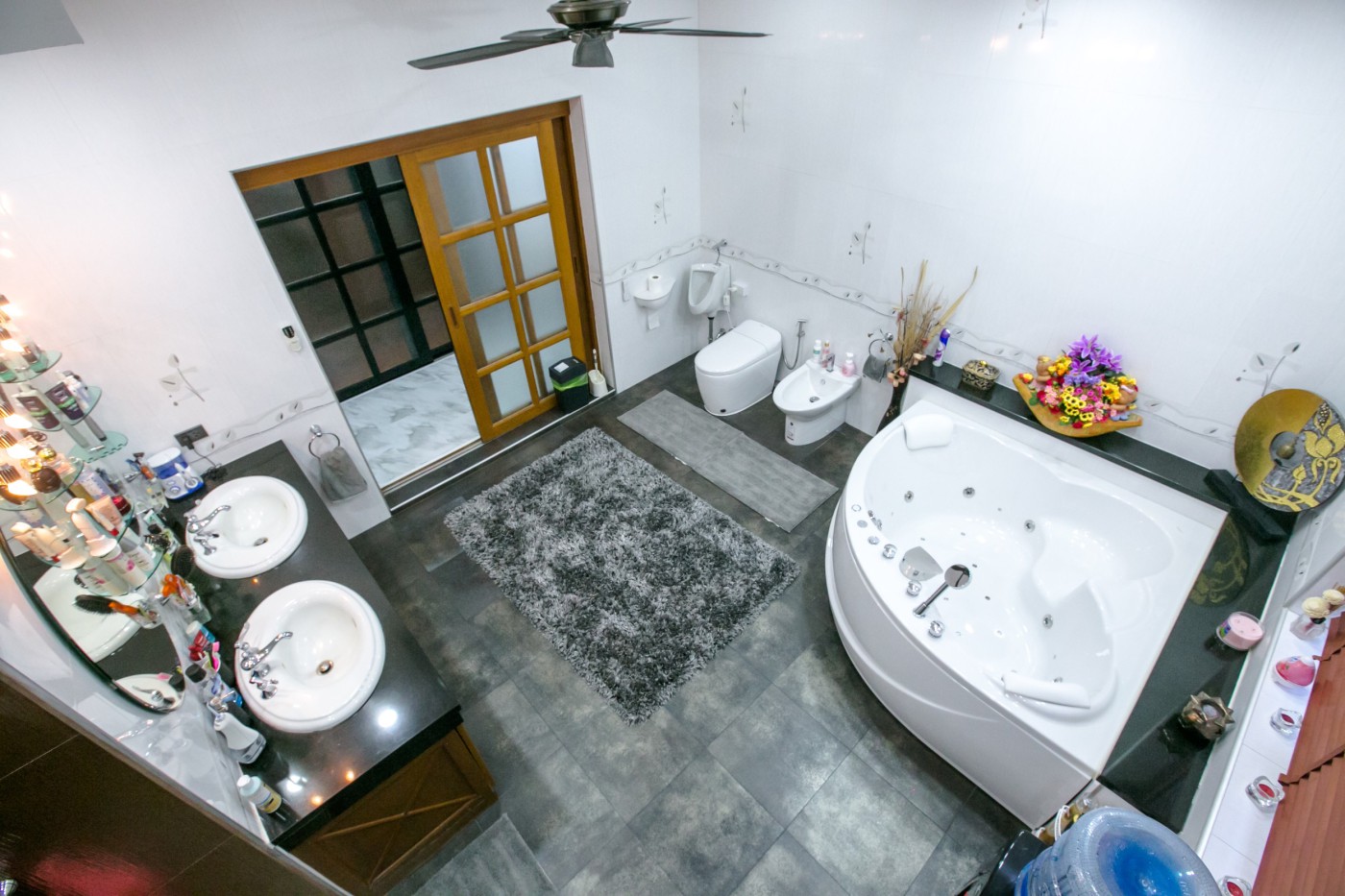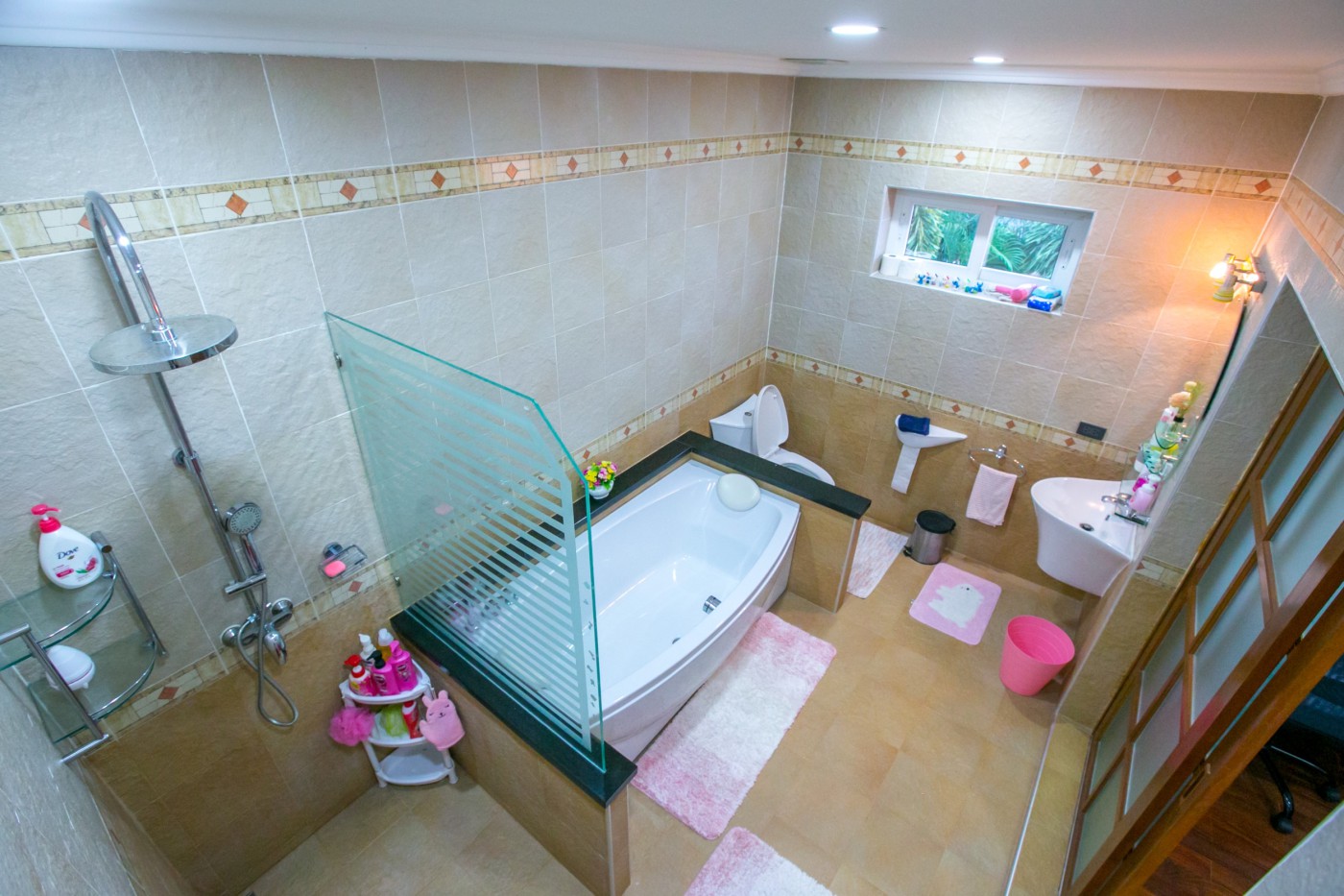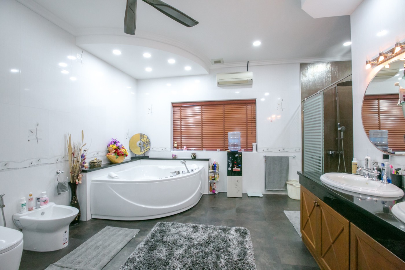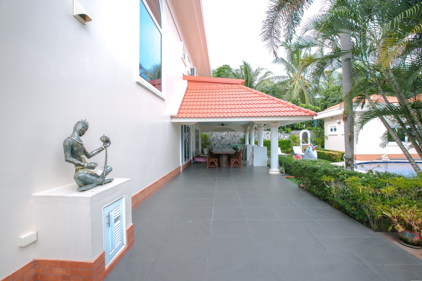 The outdoor area is equally impressive, with a stunning private swimming pool that is surrounded by a beautiful garden, perfect for lounging and entertaining. You can also relax in the Jacuzzi or enjoy a cocktail on the pool deck while admiring the beautiful tropical landscape.
