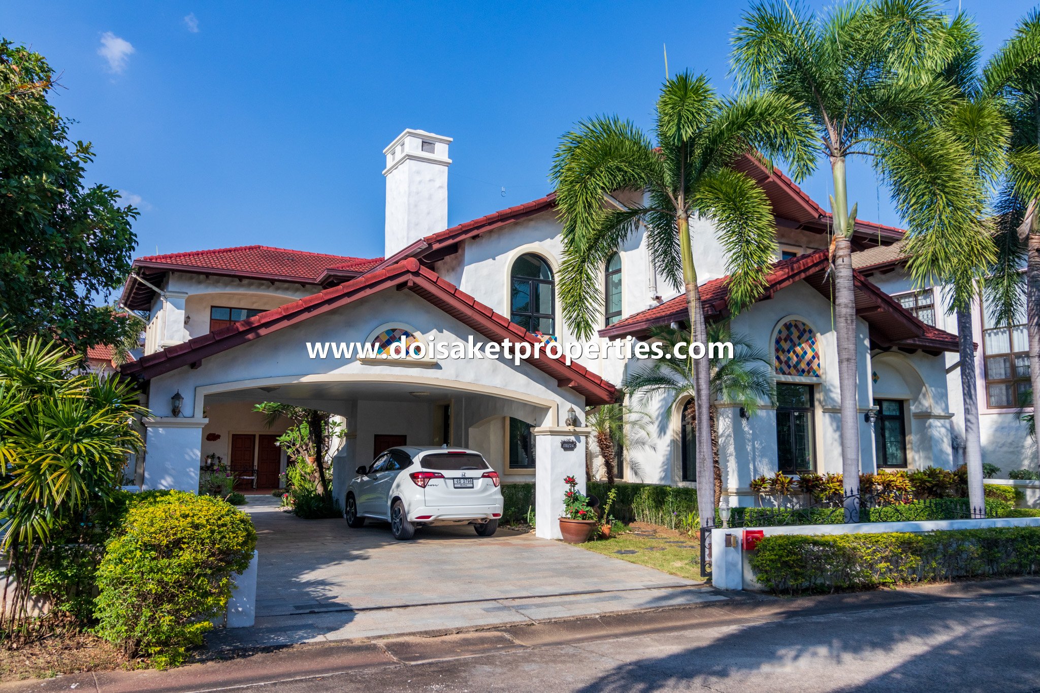 HS34304 Luxurious Large Spanish Villa Style Home for Sale in Palm Springs Nong Hoi Chiang MaiPrice: 29990000 Baht tax and transfer fee 50/50 Land Size: 146 . 584 m2 Living Area: 400 m2CLICK HERE TO WATCH THE VIDEO : are happy to offer for sale this beautiful and spacious fullyfurnished Spanish Villa style home in the prestigious Palm Vi...