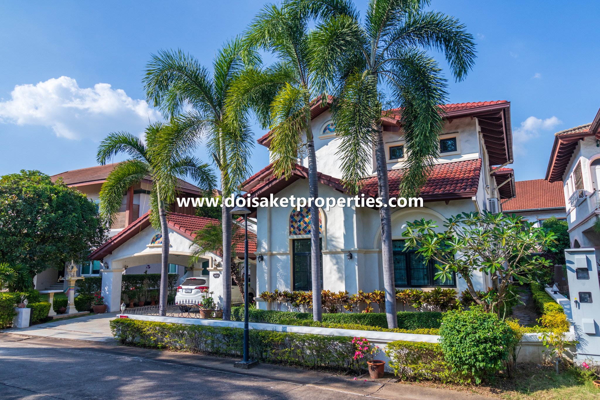 HS34304 Luxurious Large Spanish Villa Style Home for Sale in Palm Springs Nong Hoi Chiang MaiPrice: 29990000 Baht tax and transfer fee 50/50 Land Size: 146 . 584 m2 Living Area: 400 m2CLICK HERE TO WATCH THE VIDEO : are happy to offer for sale this beautiful and spacious fullyfurnished Spanish Villa style home in the prestigious Palm Ville area of the Palm Springs moo baan in Chiang Mai. The luxurious house comprises 4 bedrooms 4 bathrooms a large living room TV room European kitchen carport for 2 cars and laundry room. There is a lovely curved staircase with exquisite custommade Italiandesigned wrought iron rail. At the back of the house is a nice terrace Thai kitchen and small waterfall. Trees have been planted around the house to provide shade and the house is tastefully designed and decorated with highquality materials and touches. The moo baans amenities include a swimming pool gym green park and 24hour security. The home is centrally located near shopping restaurants international schools and more but in a very peaceful and quiet location just: