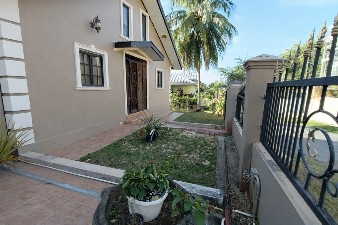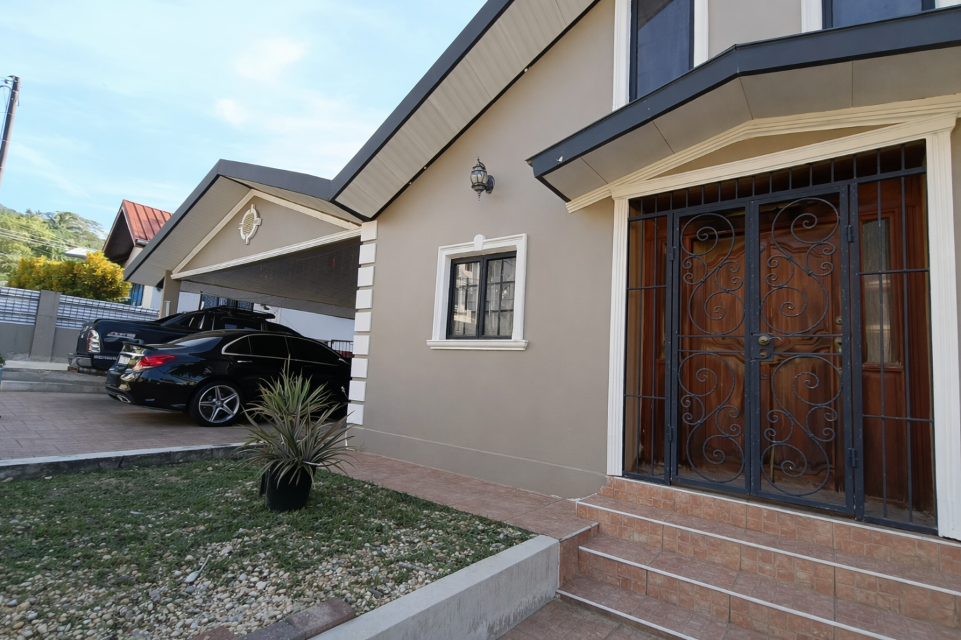 - Covered front garage & remote-control security gate