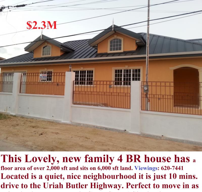This Lovely, new family 4 BR house has a floor area of over 2,000 sft and sits on 6,000 sft land. Located is a quiet, nice neighbourhood it is just 10 mins. drive to the Uriah Butler Highway. Perfect to move in as a family investment this CHRISTMAS! Viewing by Appointment only: 752-7513 OR 375-7756.