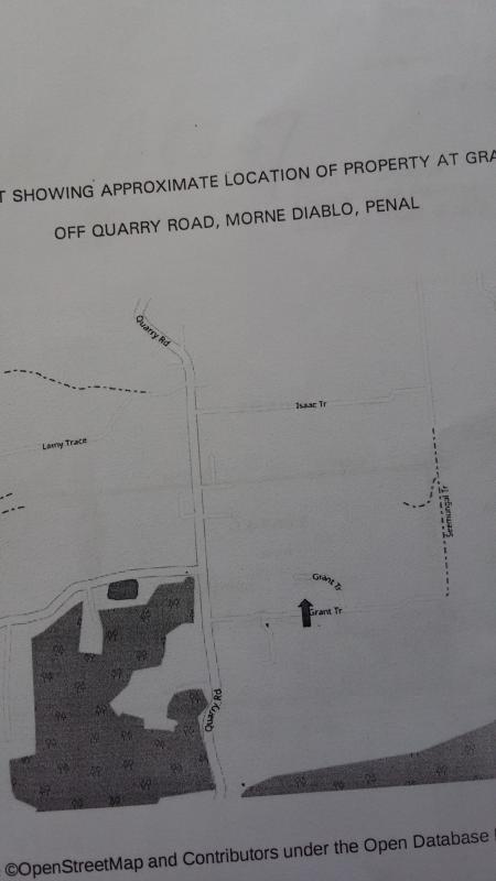 5.4 Acres of land for sale, ideal for land development ,located at grant trace off Quarry Road, Mon Diablo, Penal. Nicely paved road ,lights and water. Good road frontage.(see cadastral) 5 Lots sold from original parcel leaving this 5.4 acres The land has some teak trees. Serene surroundings. Price $1,950,000.00