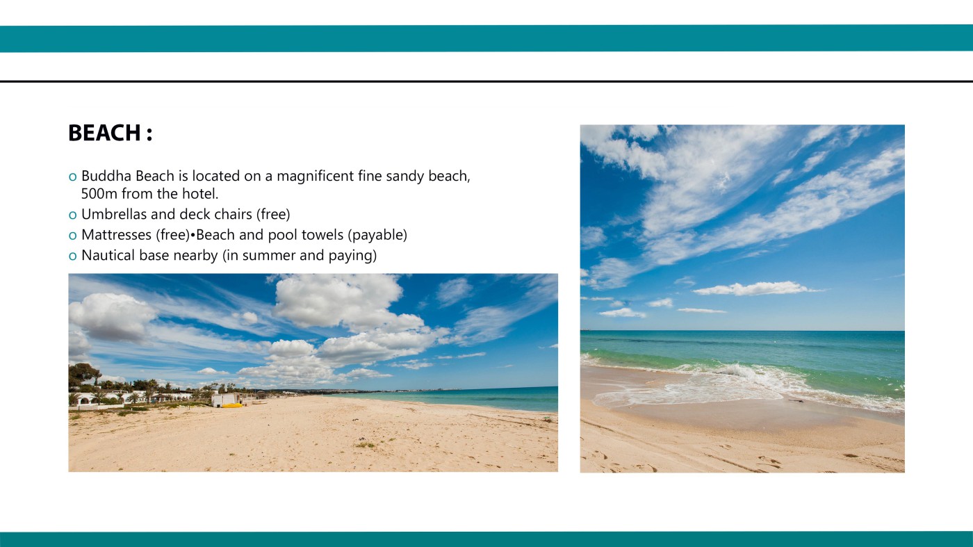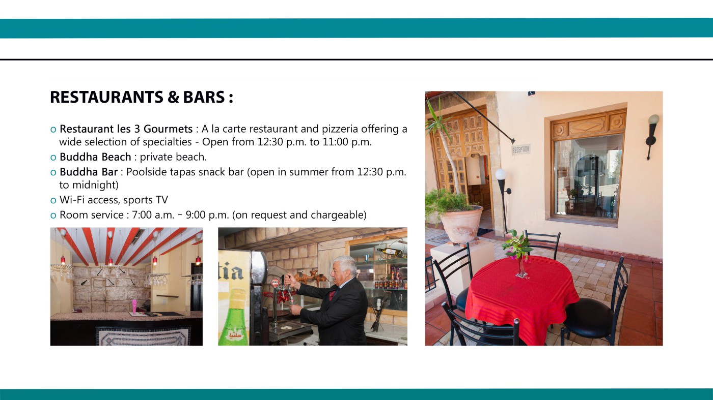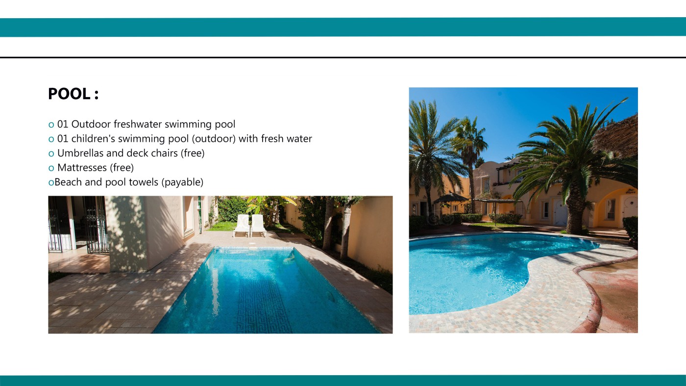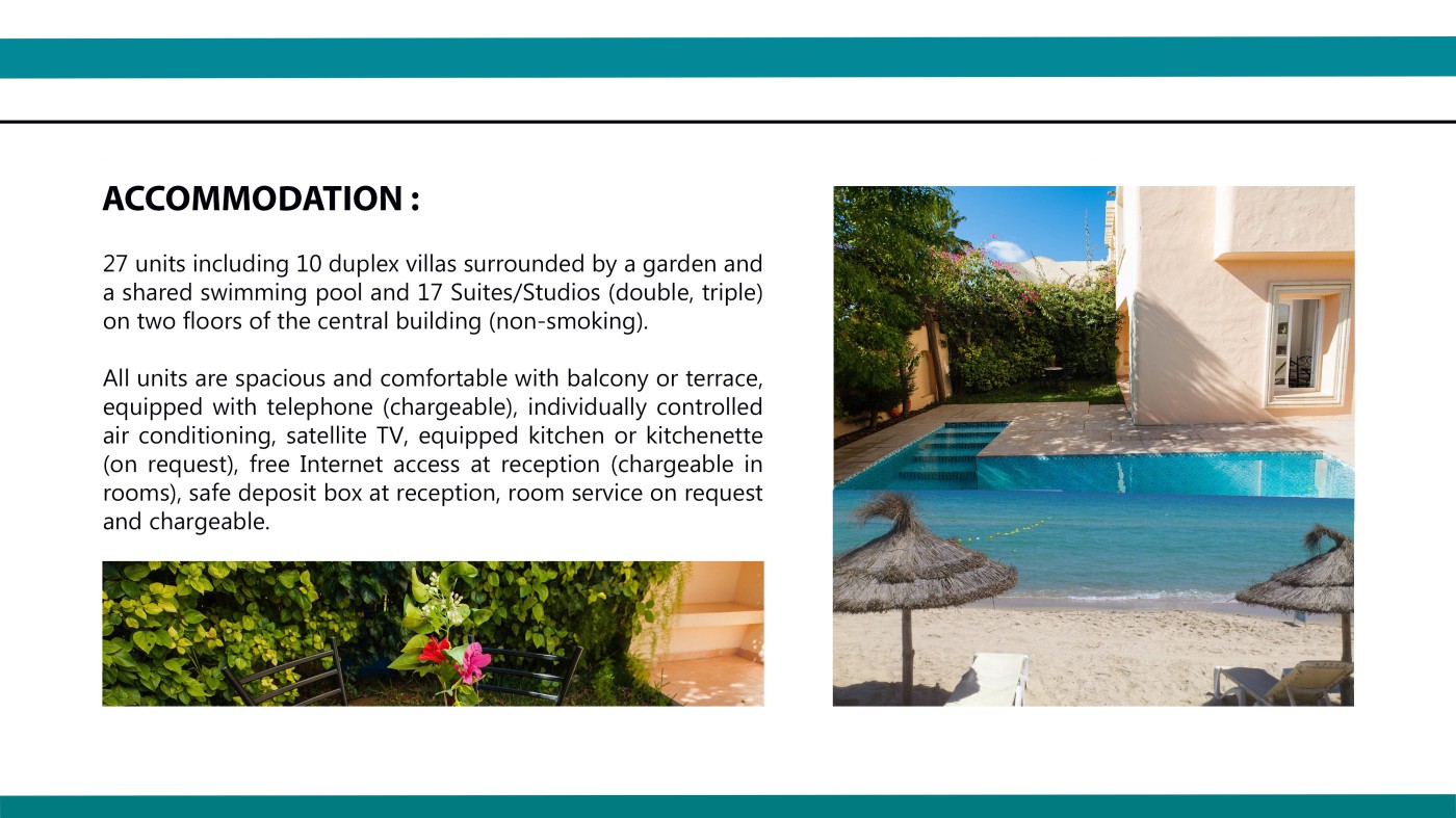 Located on the south coast of Hammamet, 500m from a sandy beach, the structure is ideal for guests