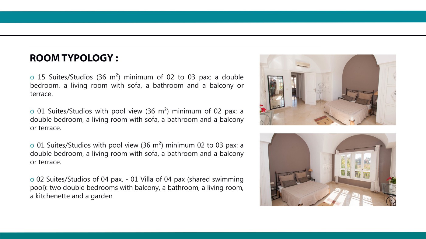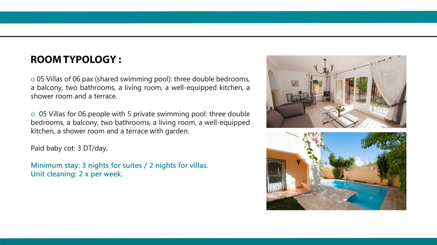 02 Suites/Studios of 04 pax. - 01 Villa of 04 pax (shared swimming pool): two double bedrooms with