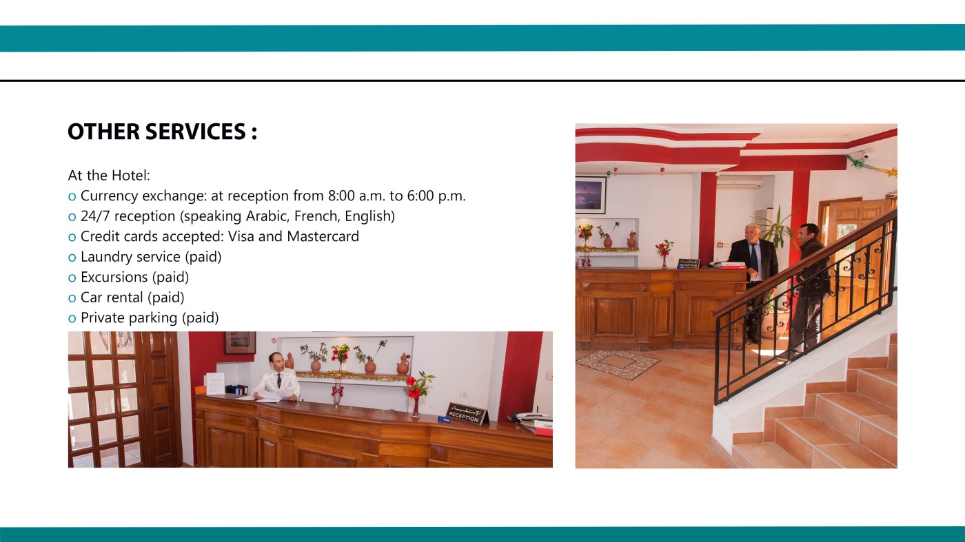 Internet access at reception (chargeable in rooms), safe deposit box at reception, room service on