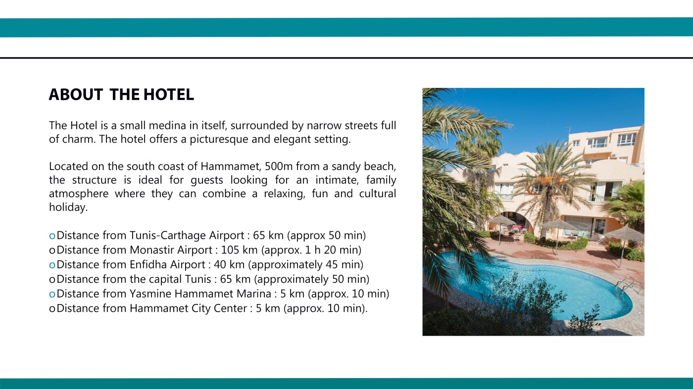 o Distance from Hammamet City Center: 5 km (approximately 10 min).