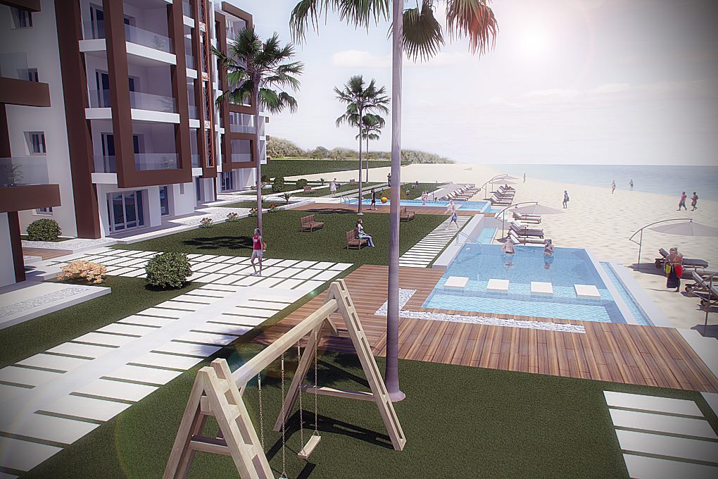 Residence Amwej offers of high standard with a range of apartments from studios to S 3 directly on the seafront on one of the most beautiful beaches in Tunisia, with gardens, swimming pools and garage in the basement. The residence is monitored and offers a high quality finish.