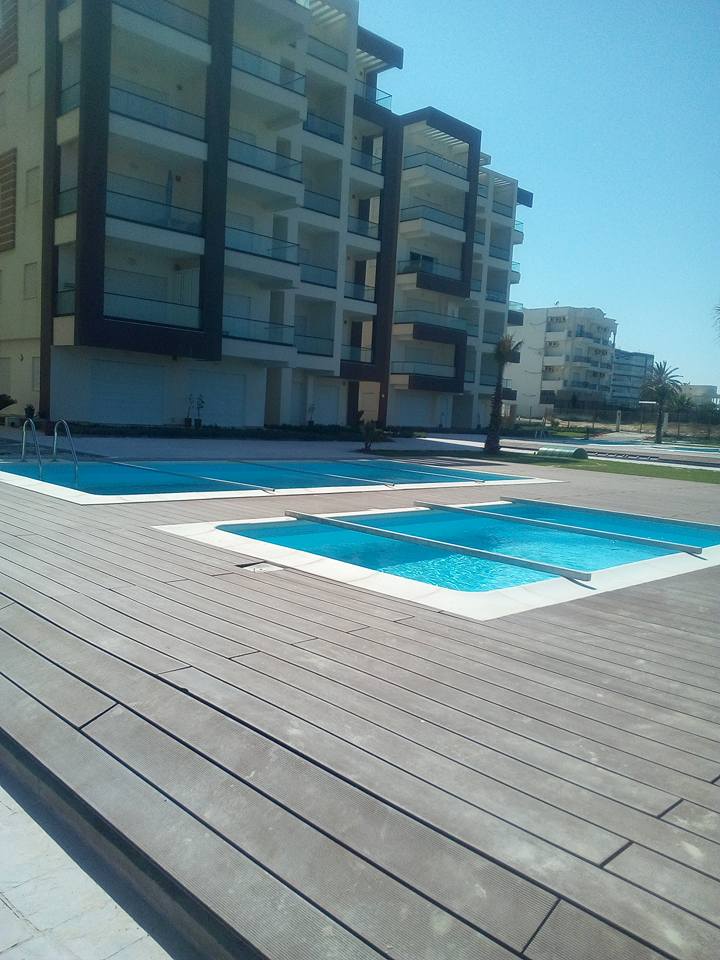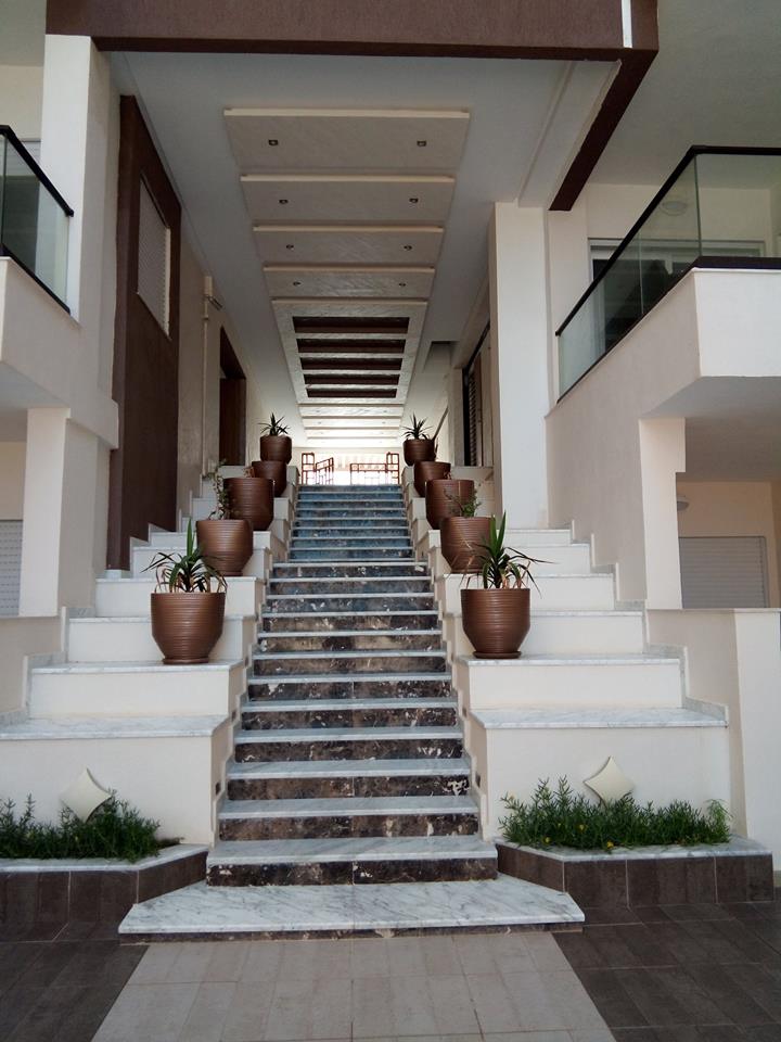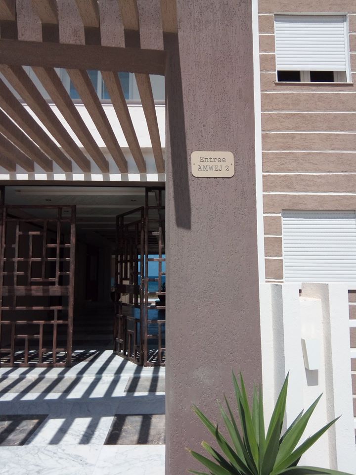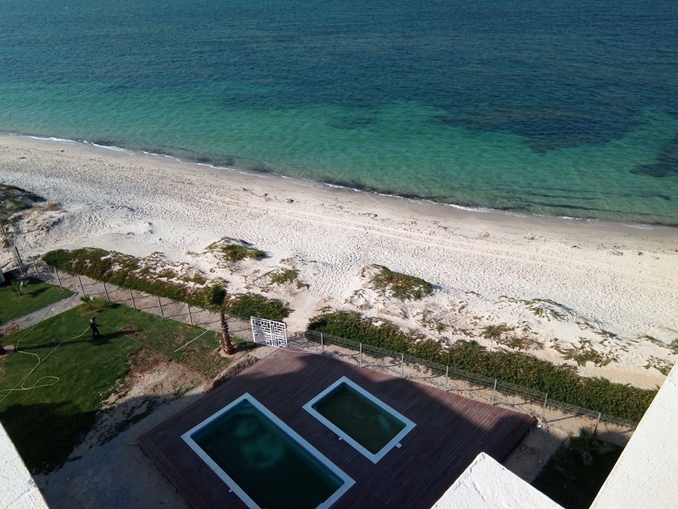 on one of the most beautiful beaches of Tunisia, with gardens, swimming pools and garage in the basement. The residence is