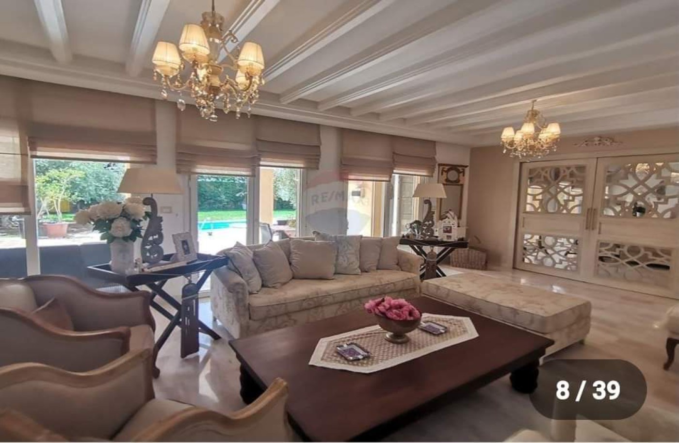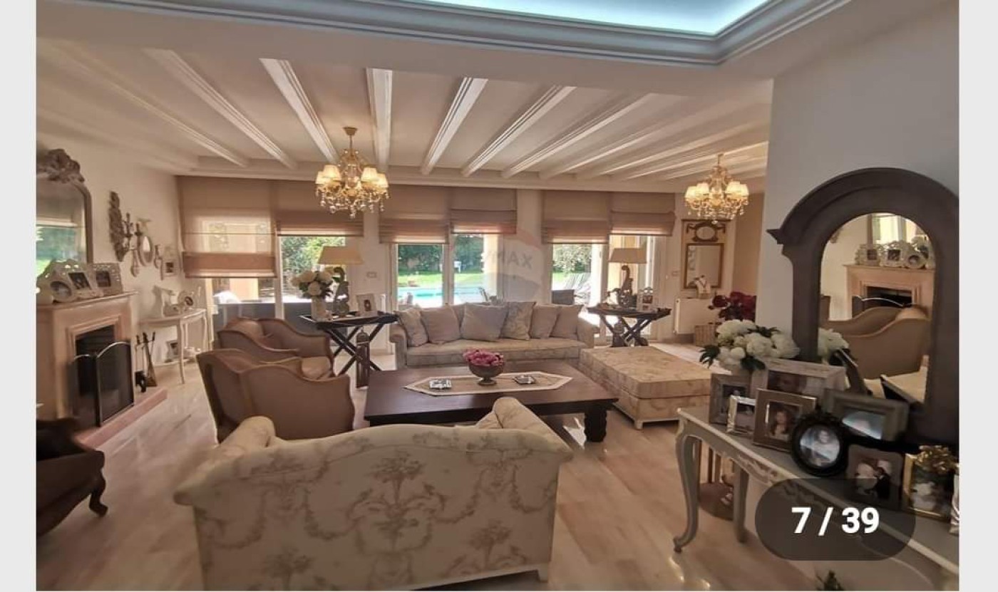 The ground floor is made of marble, while the floor is made of wooden floor. The villa is equipped with central heating and air conditioning, a marble open fireplace, cameras, and an alarm system, a water reservoir, luxury materials, and woodwork, as well as monochrome painting.
