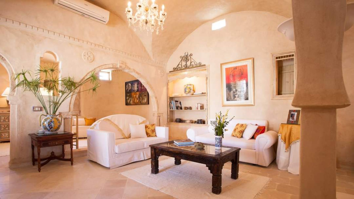 4 suite (chambre avec salle de bain ) chaque suite à un terrasse vu sur piscine/jardin Un grand salon composè de 3 partie : salle à manger salon , dedicated work place Localisation : bomalel / Homet souk Djerba