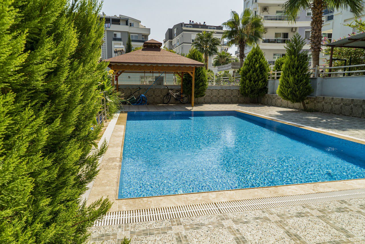 Apartment in Antalya, fully furnished, pool, security, parking, 1700 meters from the y are bus stops, shops, cafes, -groomed green area,The apartment has air conditioning, near a magnificent view of the mountains