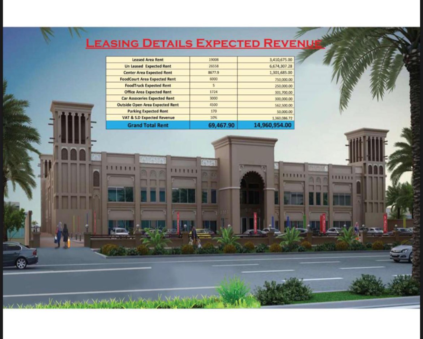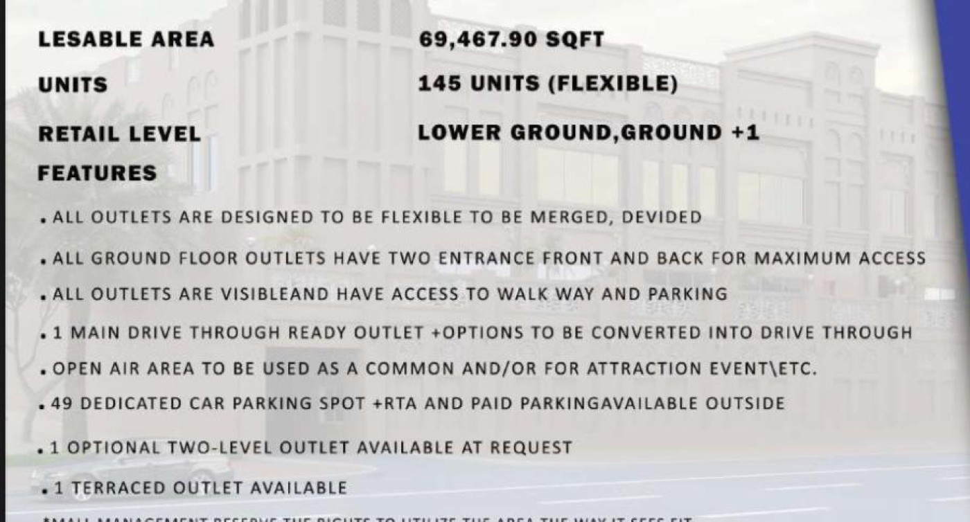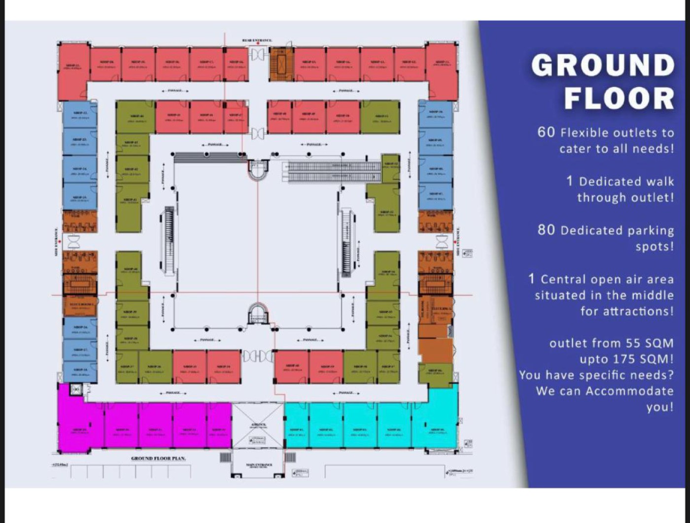 Mall for sale Khawaneej Gcc 1. The building including land is estimated to 219m as per rera. 2. Rent generated as at present is 9m plus including allsignedagreements. 3. In case of 100% occupancy is Expected 17m this is excluding the empty areas which can be used for koisks. 4. Since it`s not officially opened no branded companies available. 5. Started 2015 and completed 2018 (accomplishment certificate available). 6. No bank account in the name of center. Also note that we have provided 5 electricity and water and drainage in the middle of the center in case of renting and also there is a big terrace on the 1st floor which can be used for cafeteria or any other suitable use. price 210 m