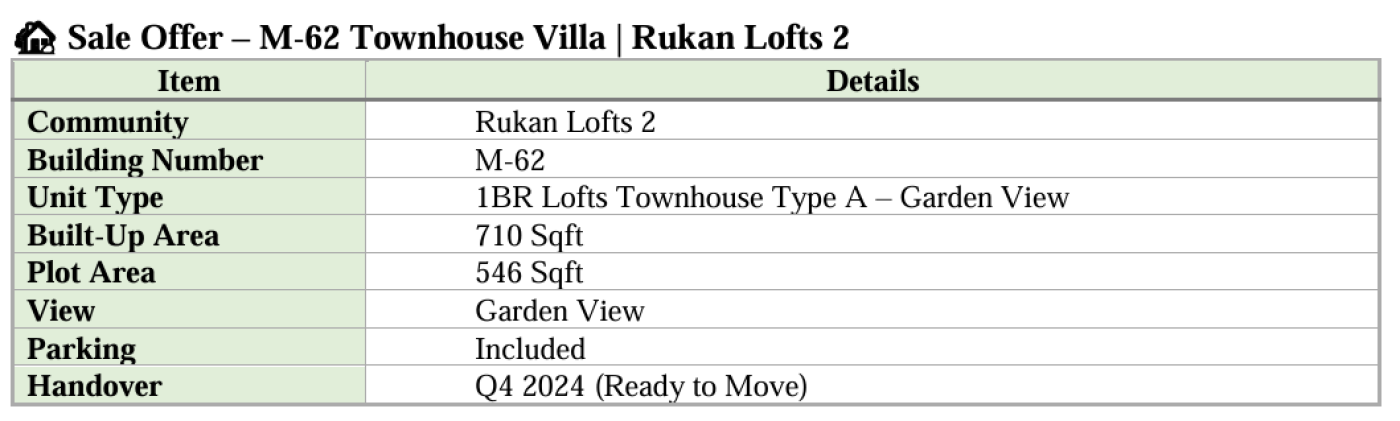 Sale Offer M-62 Townhouse Villa | Rukan Lofts 2 Item Details Community Rukan Lofts 2 Building Number M-62 Unit Type 1BR Lofts Townhouse Type A �` Garden View Built-Up Area 710 Sqft Plot Area 546 Sqft View Garden View Parking Included Handover Q4 2024 (Ready to Move) Remarks • Buyer is responsible for all developer and government fees. • Cash payment only. • Unit price and availability are subject to change without notice. • Property is under an initial sale contract; final transfer subject to developer and DLD approval.