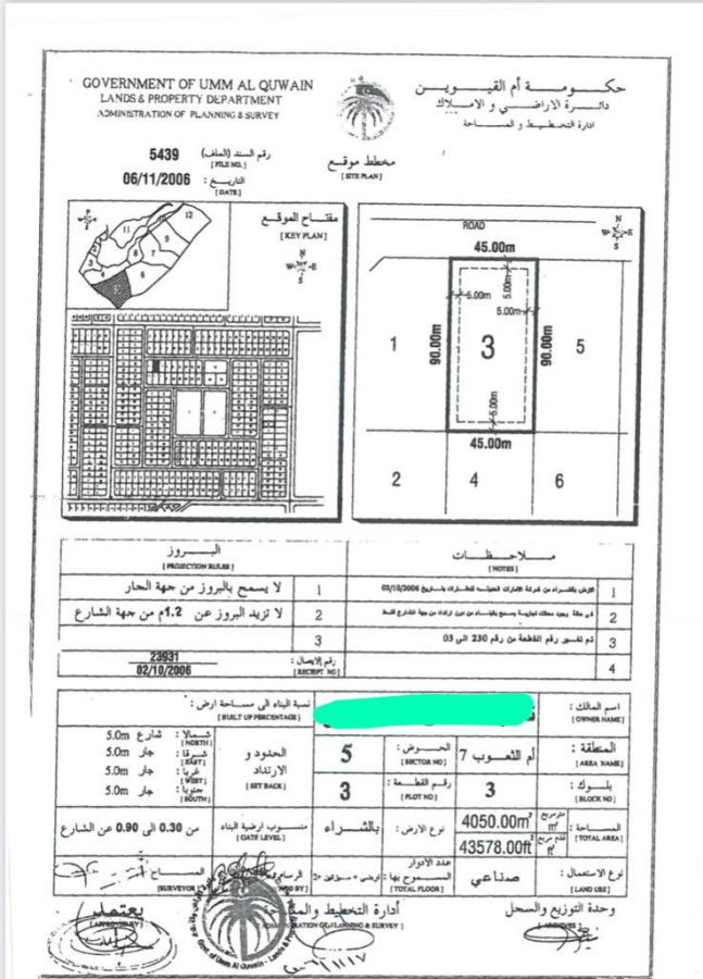 For sale industrial land in the Emirate of Umm Al Quwain in the United Arab Emirates in the new industrial area. The land area is 43578 square feet. The land is authorized to build a ground + two budgets + two floors