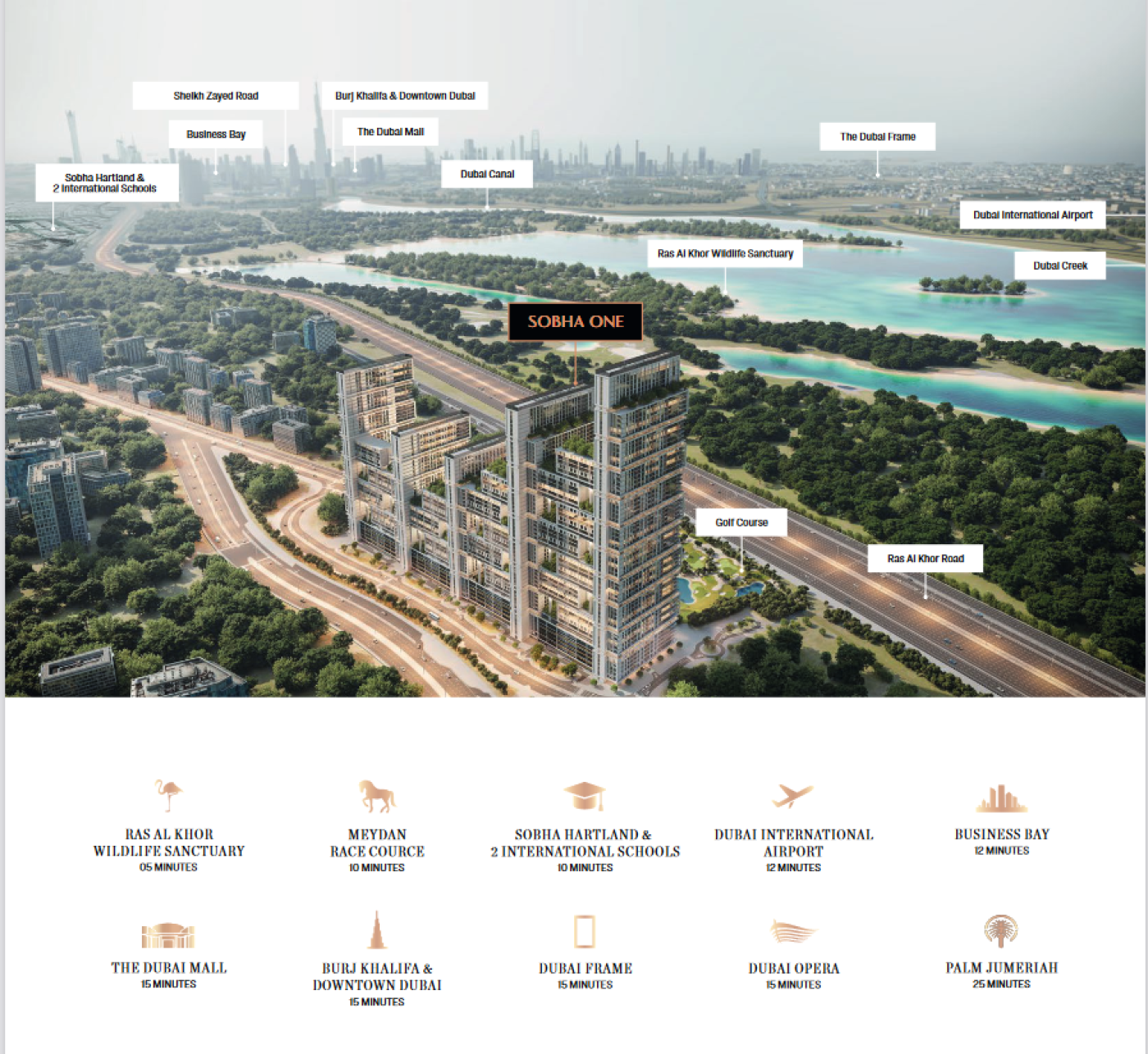 Sobha One will become home to 9,500 residents. There is no doubt that this project will become one of the most coveted addresses in Dubai. This can be explained by its location just 15 min. from Burj Khalifa and downtown, 12 min. from Dubai International Airport and 25 min. of Palm Jumeirah Another important factor is the free facilities they offer to the owners: