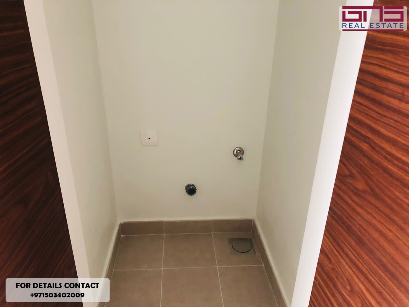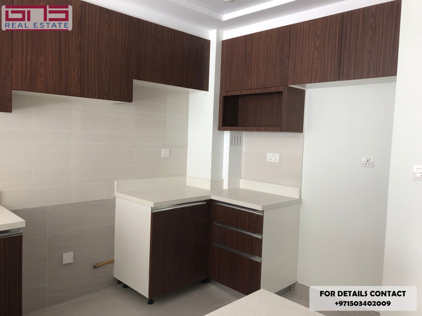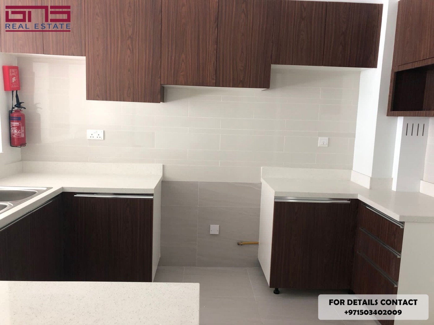 * Kitchen that is partially open and has high-quality wood cabinetry and counters<...