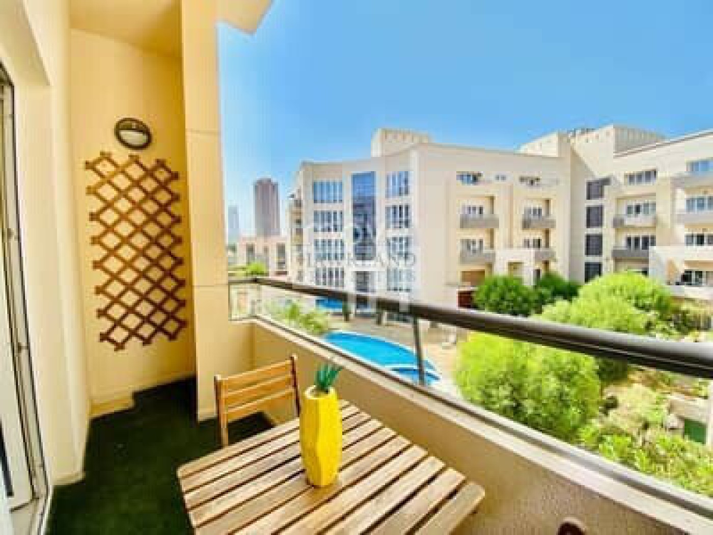 Spacious living area with a balcony that offers stunning views of the pool