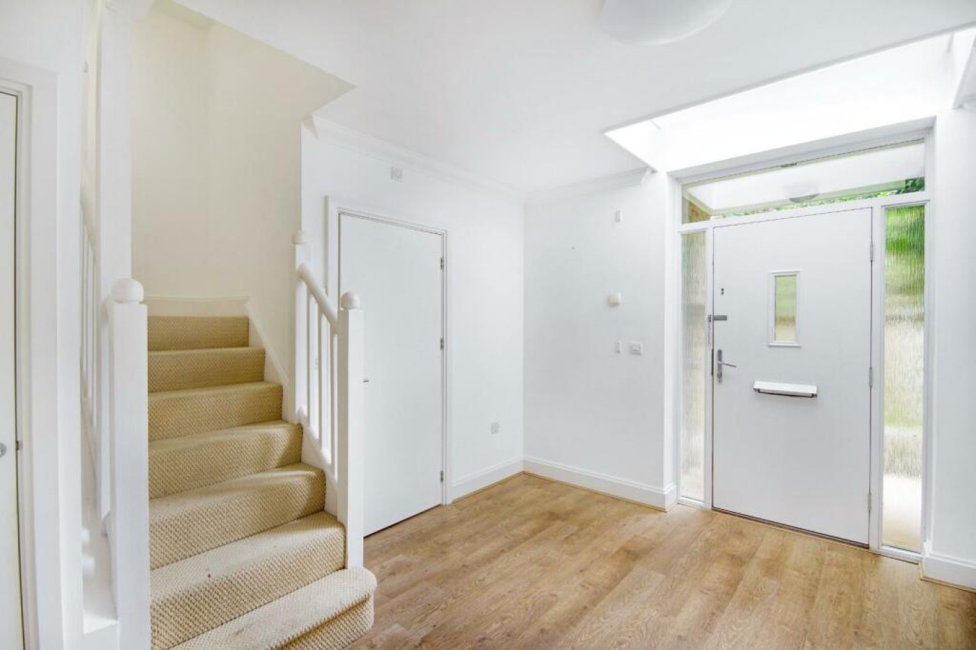 There is a welcoming entrance hall finished with a skylight and engineered oak flooring, with a useful