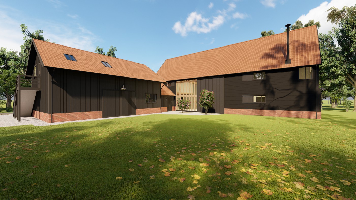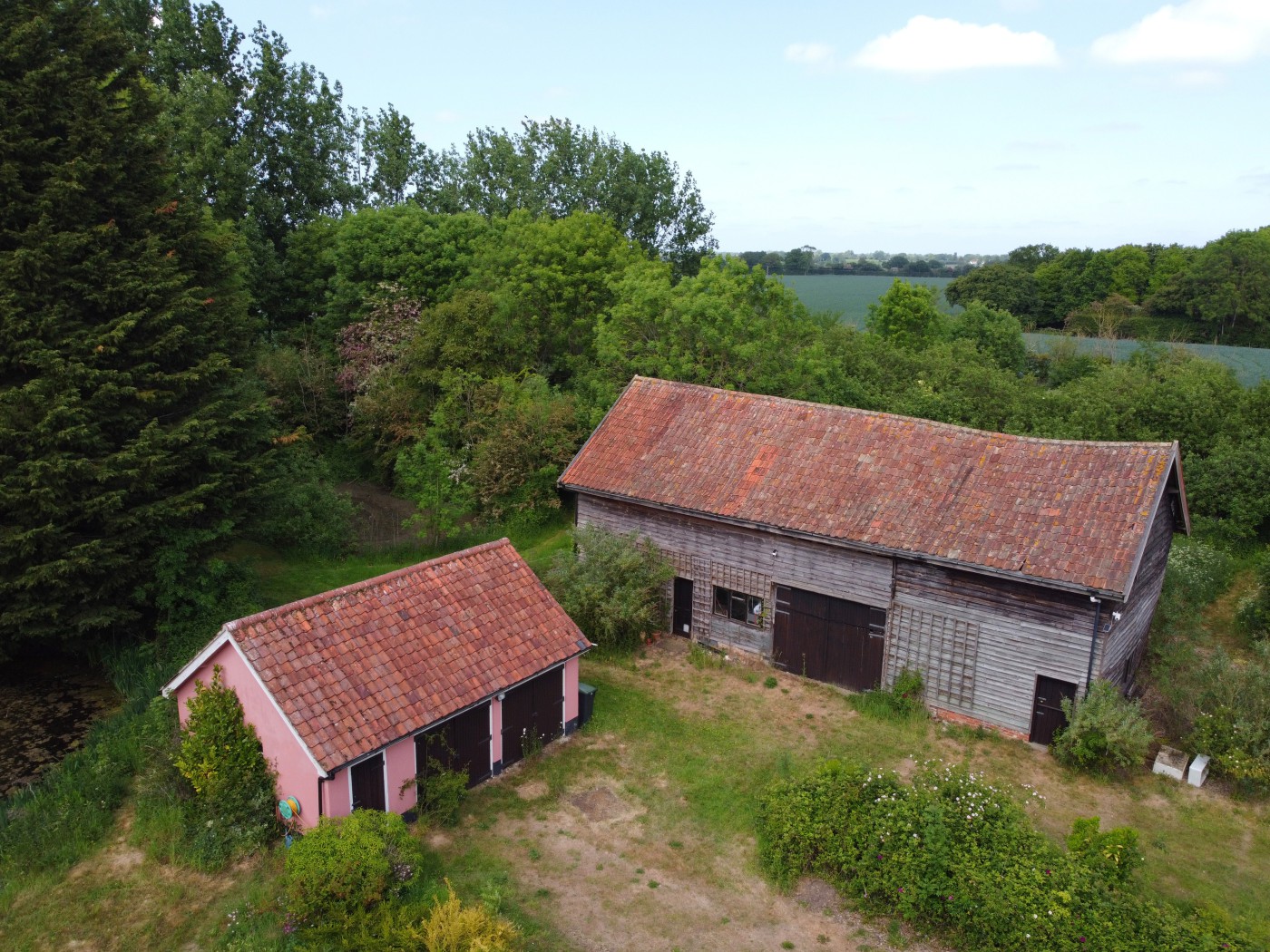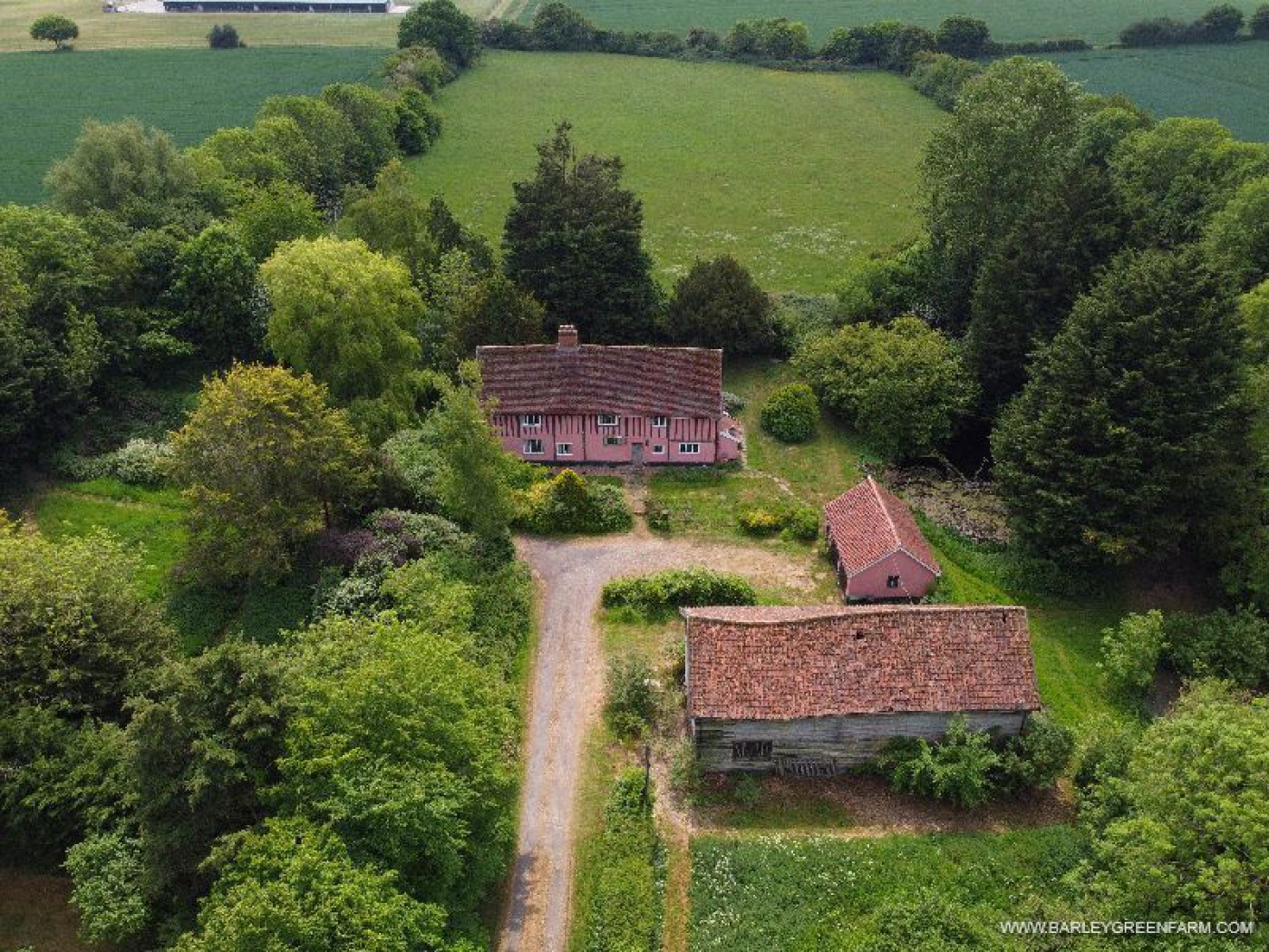 BARLEY GREEN FARM is a Grade II-Listed timber-framed moated Suffolk farmhouse with land and large barn (with planning permission) for sale.