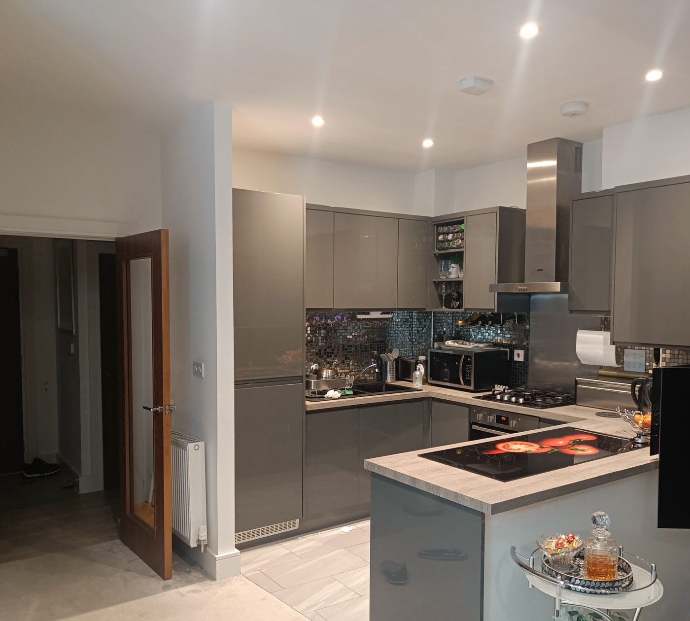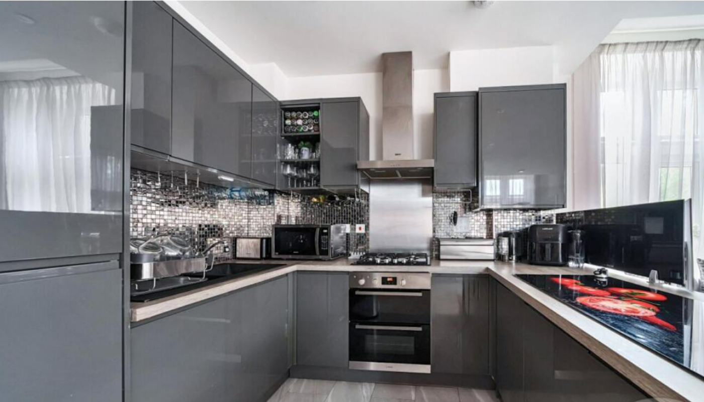 The newly modernised kitchen features sleek finishes, contemporary cabinetry, integrated appliances, and generous cupboard space.