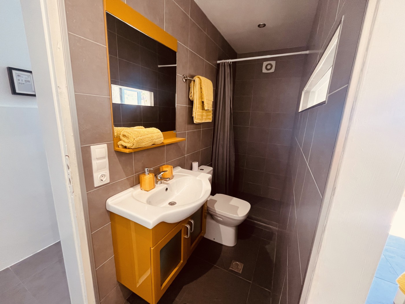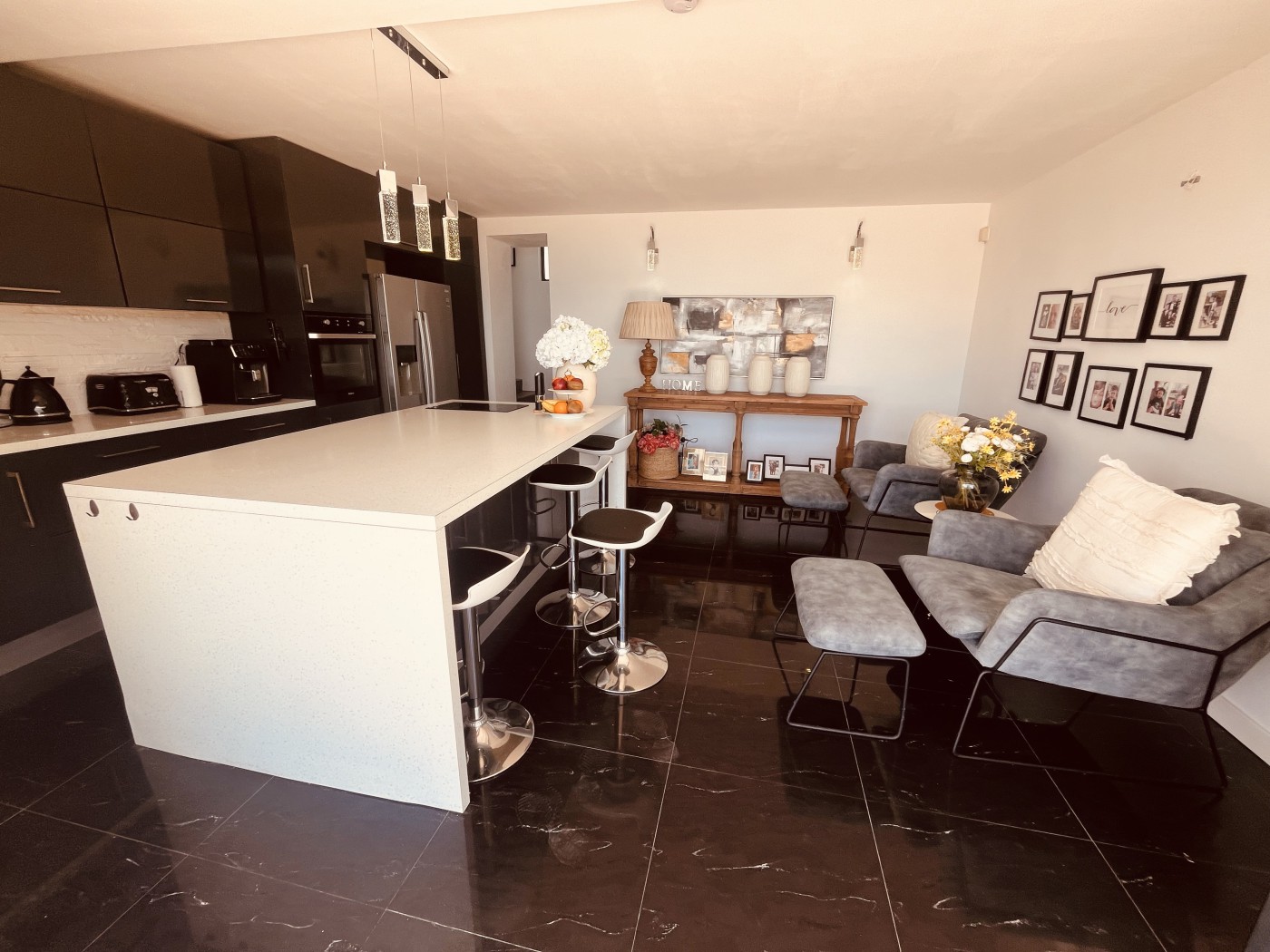 bathroom and a contemporary fitted kitchen featuring a central island and wide bi fold