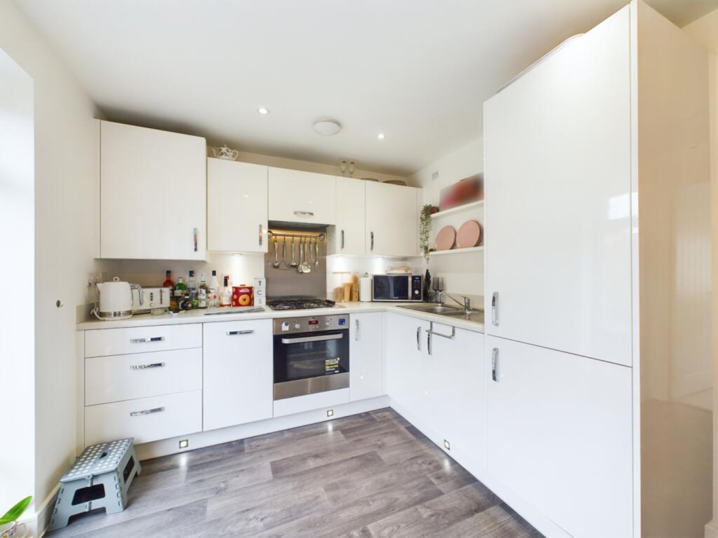 cabinetry, integrated appliances including a dishwasher and fridge freezer, and ample counter space.