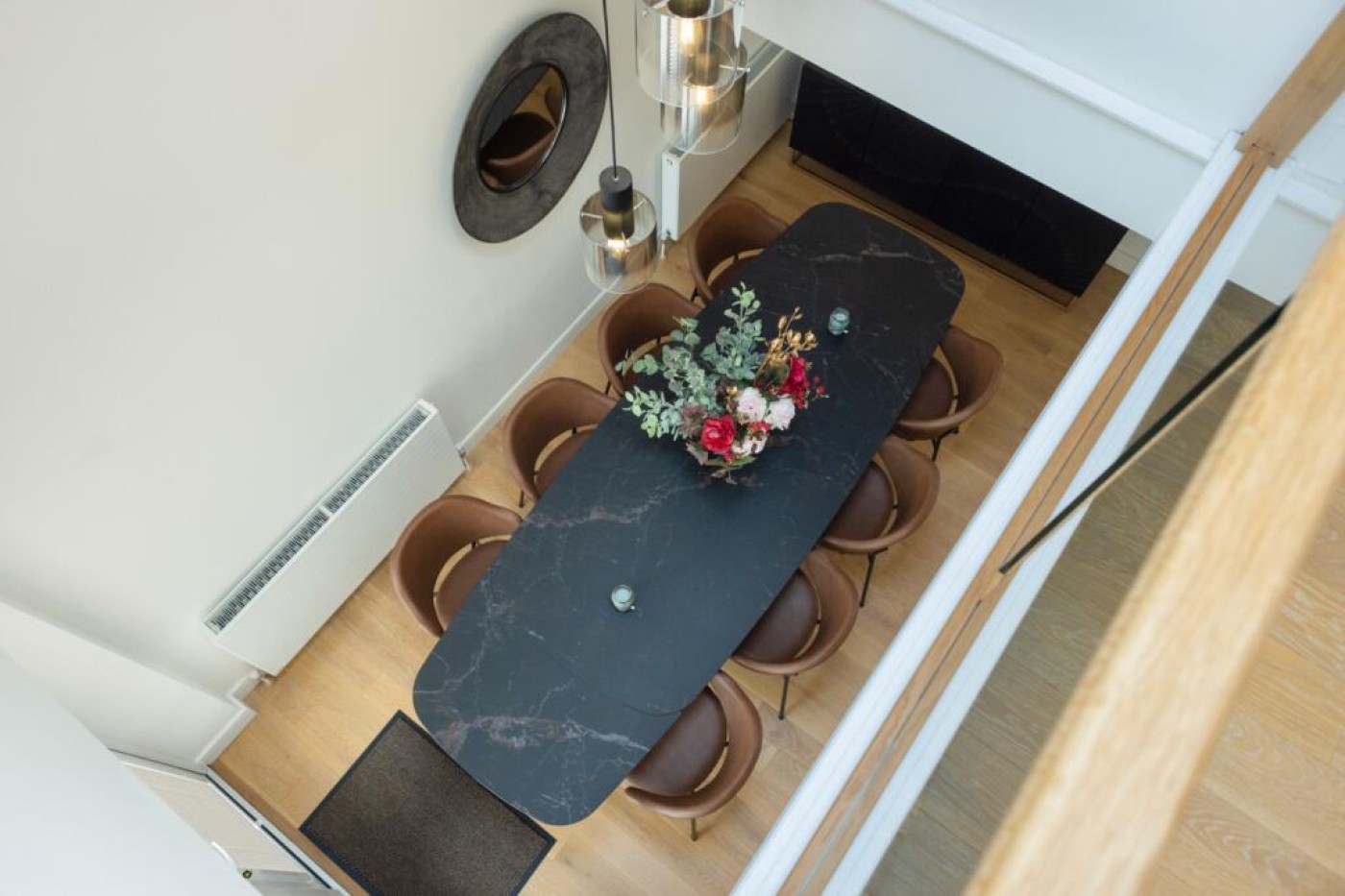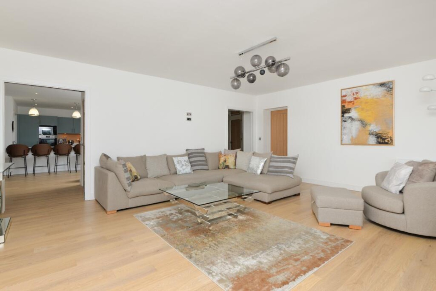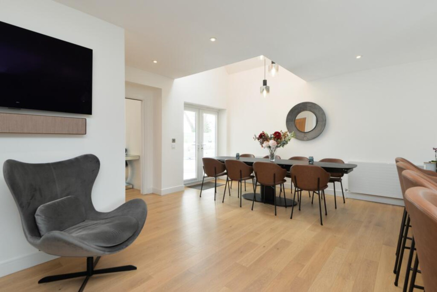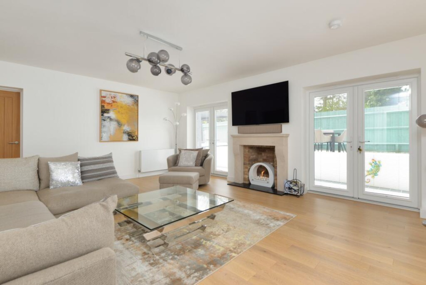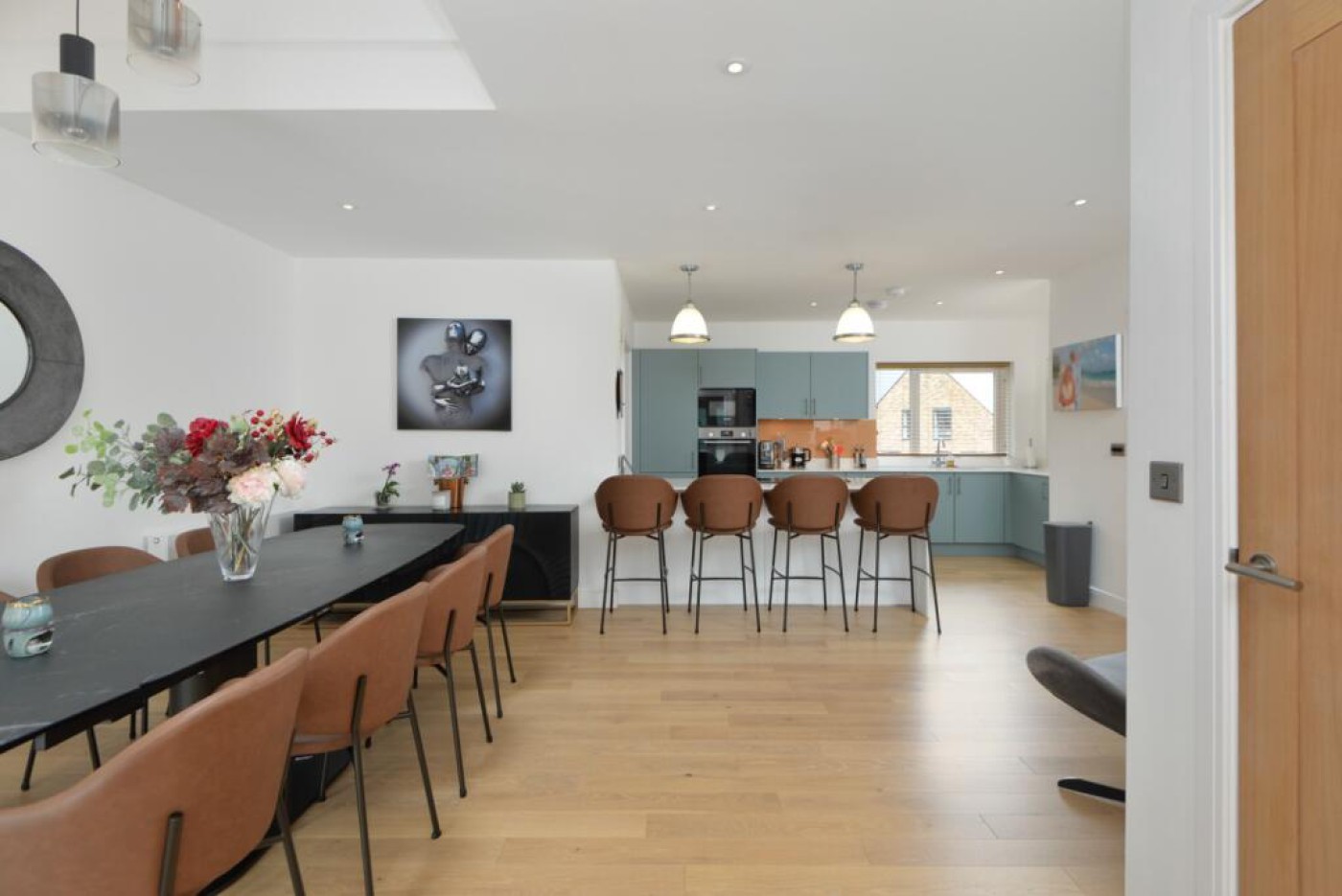 doors enable the living room and dining room to be separated if so desired. Oak engineered flooring and