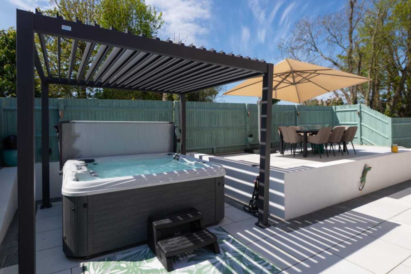 complimented by water features and Nova fire pits and a hydrotherapy hot tub sits beneath a pergola for