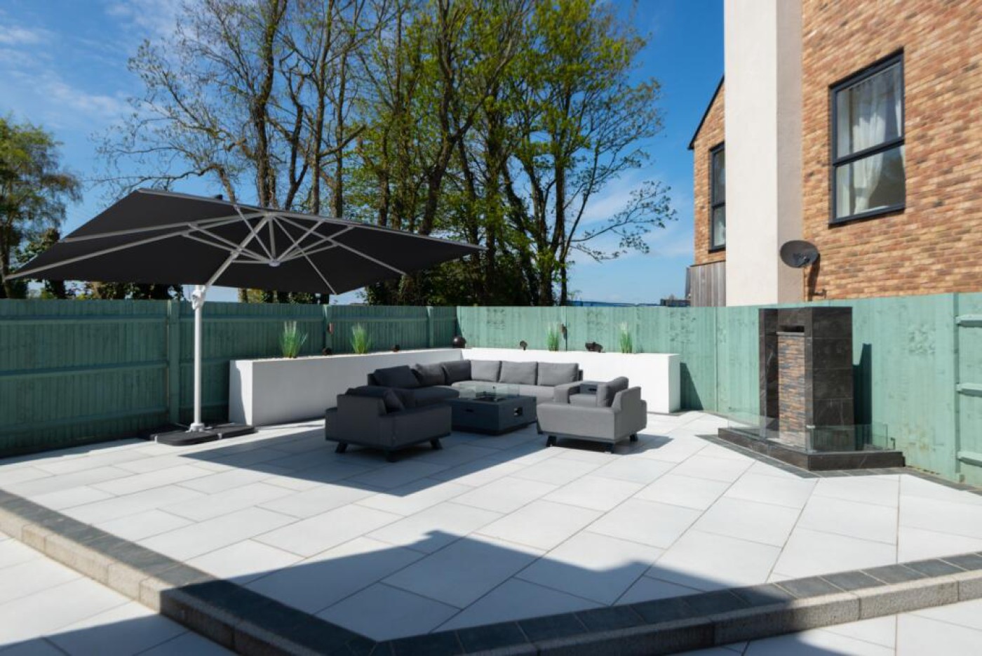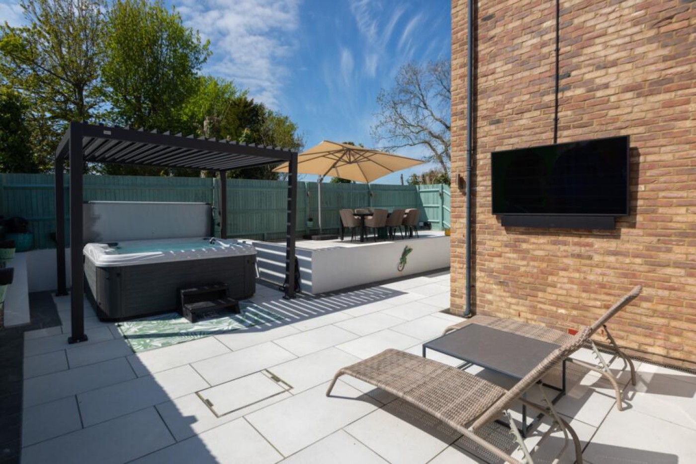 a 65” Samsung Terrace all weather outdoor TV, bespoke lighting, and outdoor double power sockets with