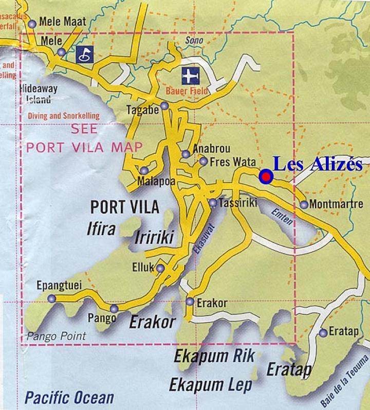 Les Alizes are 10 mn from downtown Port Vila, it offers a main building with a 100 M2 loft plus decks with incredible panoramic views of the Ocean and the lagoons, one flat (70 M2) with 2 private patios , 6 self contained and independant cottages (50 M2) with private patios, a 11M fresh water pool. all that on a slopping 4000 M2 tropical park easy build in income with 7 rentals short or long term as you wish.